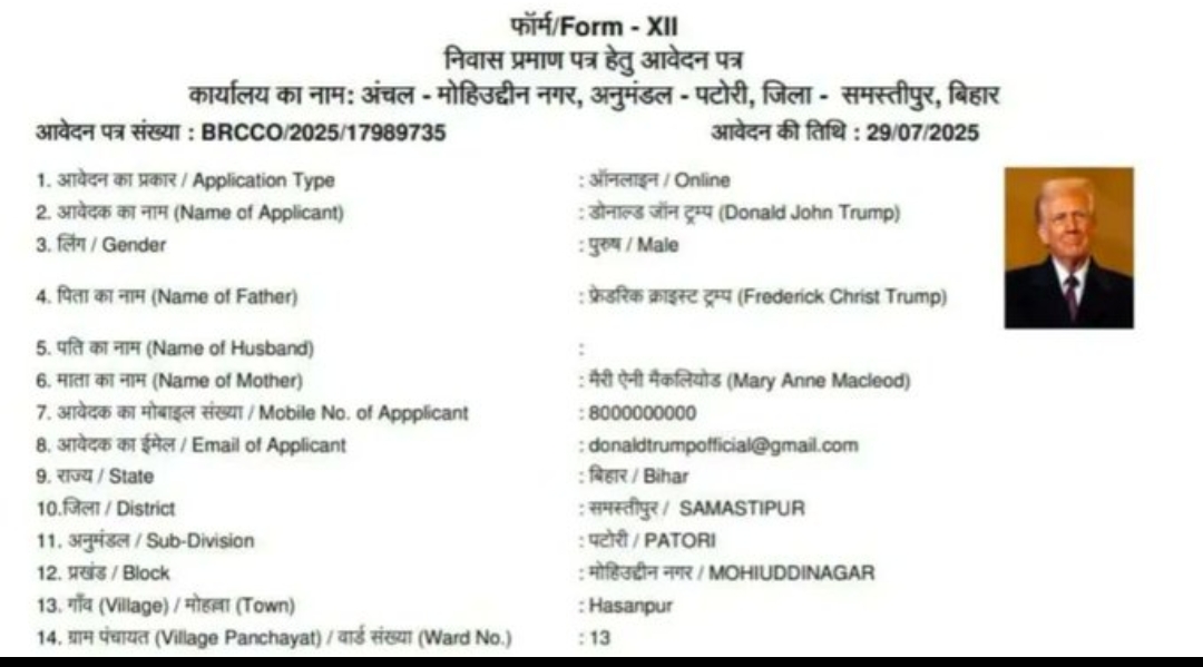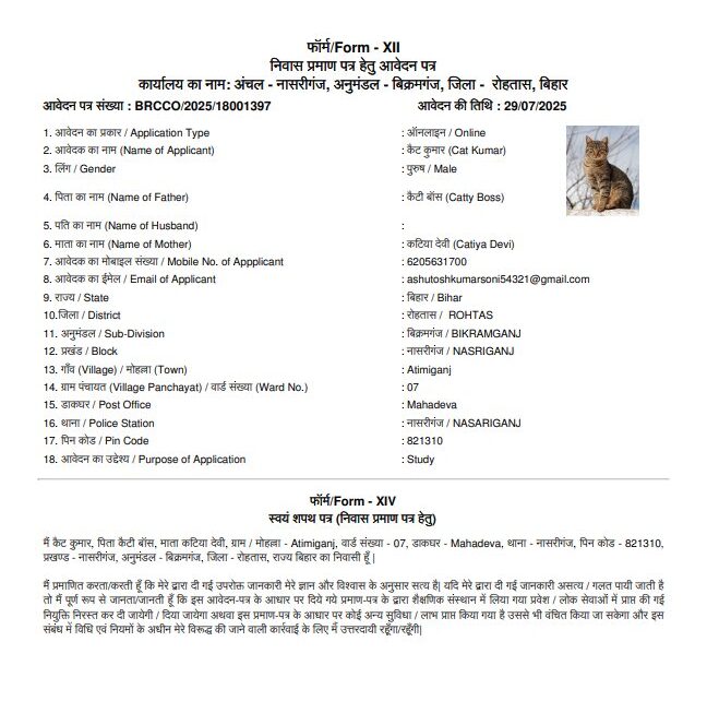 नाम : कैट कुमार पिता : कैटी बॉस माता : कटिया देवी बिहार में इस नाम से निवास प्रमाण-पत्र के लिए ऑनलाइन आवेदन हुआ है। राजस्व कर्मचारी कौशल पटेल ने आवेदन करनेवाले के खिलाफ पुलिस में शिकायत की है।