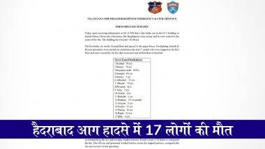 तेलंगाना फायर डिपार्टमेंट की ओर से जारी प्रेस नोट में हैदराबाद चारमीनार अग्निकांड हादसे की जानकारी साझा की गई है. तेलंगाना अग्निशमन आपदा प्रतिक्रिया एवं नागरिक सुरक्षा विभाग द्वारा जारी प्रेस नोट के अनुसार:आज सुबह 18 मई को 6:16 बजे सूचना मिली कि चारमीनार स्थित गुलज़ार हाउस चौराहे पर एक G+2 (ग्राउंड प्लस दो मंजिला) इमारत में आग लग गई है. सूचना मिलते ही मोगलपुरा अग्निशमन केंद्र से वॉटर टेंडर और टीम तुरंत मौके पर पहुंची