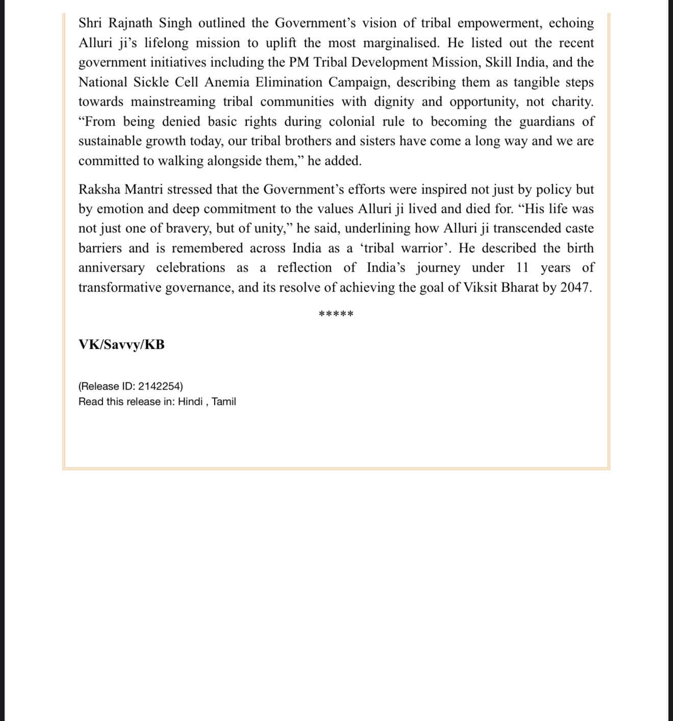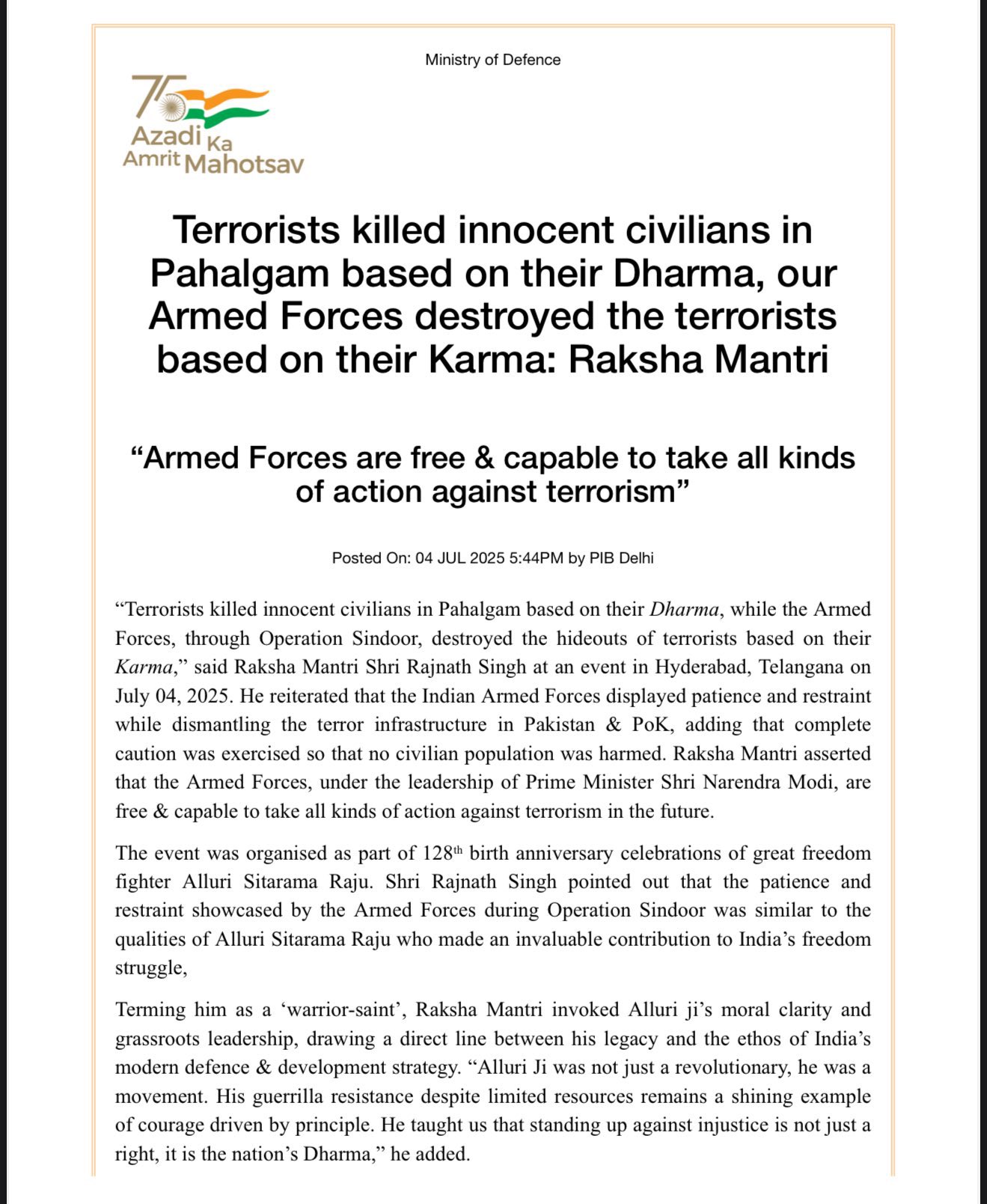 राष्ट्रीय आतंकवादियों ने ‘धर्म’ के आधार पर पहलगाम में निर्दोष नागरिकों की हत्या की, हमारे सशस्त्र बलों ने आतंकवादियों को उनके ‘कर्म’ के आधार पर खत्म कर दिया : रक्षा मंत्री राजनाथ सिंह Posted on July 4, 2025July 4, 2025 Author admin Comment(0)