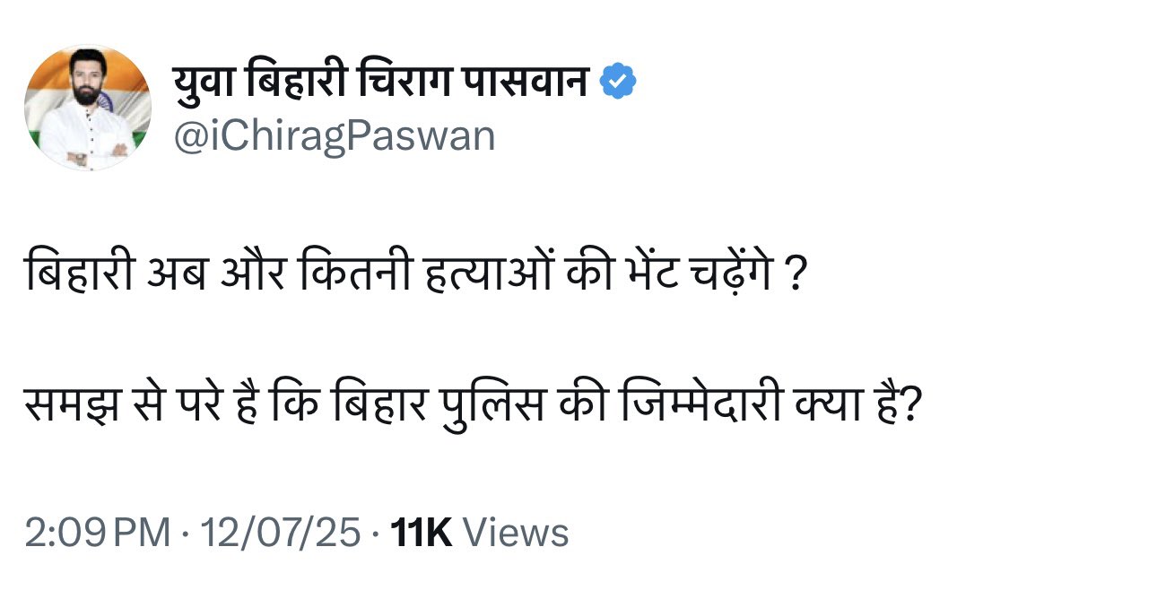 प्रादेशिक बिहार केंद्रीय मंत्री चिराग पासवान ने फिर उठाए बिहार में विधि-व्यवस्था पर सवाल ! Posted on July 12, 2025 Author admin Comment(0)
