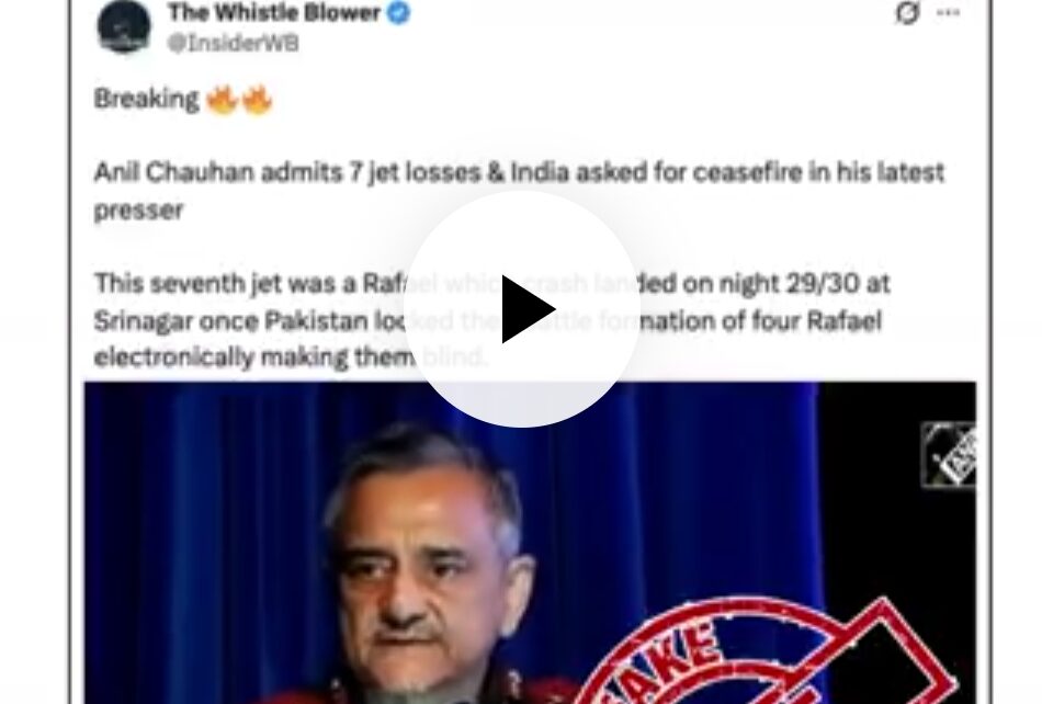एक छेड़छाड़ किया हुआ वीडियो ऑनलाइन शेयर किया जा रहा है, जिसमें चीफ ऑफ डिफेंस स्टाफ (सीडीएस) जनरल अनिल चौहान को 7 जेट विमानों के नुकसान की बात स्वीकार करते हुए और यह कहते हुए दिखाया गया है कि भारत ने युद्धविराम की मांग की थी।