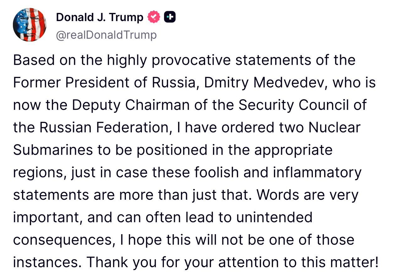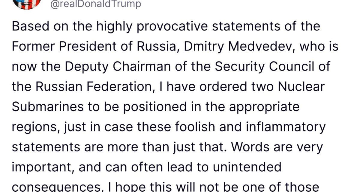 अंतरराष्ट्रीय पूर्व रूसी राष्ट्रपति मेदवेदेव के बयानों के बाद ट्रंप ने तैनात कीं परमाणु पनडुब्बियां ! Posted on August 1, 2025 Author admin Comment(0)