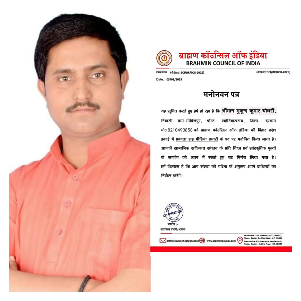 लहेरियासराय, गोविंदपुर निवासी श्री मुकुन्द कुमार चौधरी को प्रदेश प्रवक्ता सह मीडिया प्रभारी नियुक्त किया गया है। डॉ. झा ने उन्हें नियुक्ति पत्र सौंपते हुए कहा कि श्री चौधरी की सामाजिक सक्रियता, सूझ-बूझ और विचारशीलता से ब्राह्मण समाज की आवाज़ और अधिक मुखर होगी। उनके मनोनयन की खबर मिलते ही क्षेत्र में हर्ष की लहर दौड़ गई। शुभचिंतकों व समाज के प्रबुद्धजनों ने उन्हें बधाई देते हुए इसे संगठनात्मक मजबूती की दिशा में अहम कदम बताया।