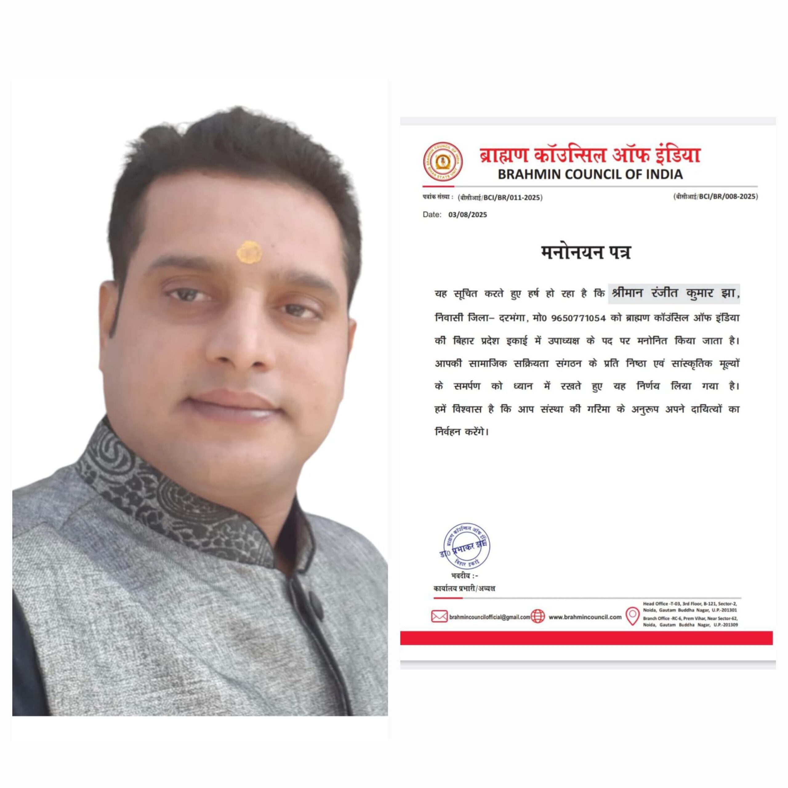 संगठनात्मक नियुक्तियों की इसी कड़ी में दरभंगा जिला स्तर पर भी नई टीम की घोषणा हुई है। दरभंगा ज़िले के रंजीत कुमार झा ‘गगन’ को जिला अध्यक्ष तथा सुबोध चौधरी को जिला महासचिव की जिम्मेदारी सौंपी गई है। यह घोषणा रविवार को ब्राह्मण काउंसिल के राष्ट्रीय संरक्षक उदय शंकर चौधरी के बलभद्रपुर स्थित आवास पर आयोजित बैठक में की गई, जहाँ सभी नवनियुक्त पदाधिकारियों को पाग-चादर से सम्मानित किया गया।
