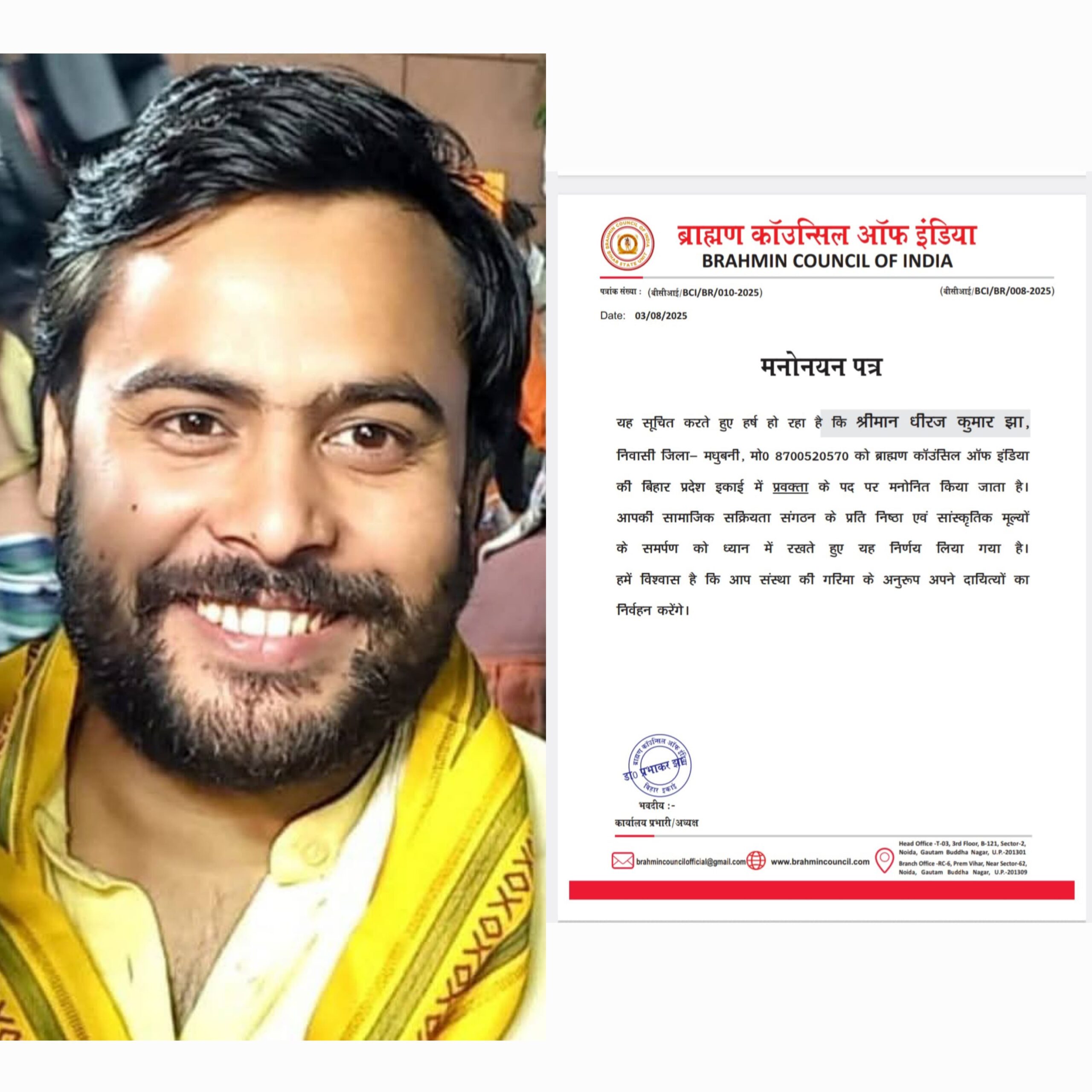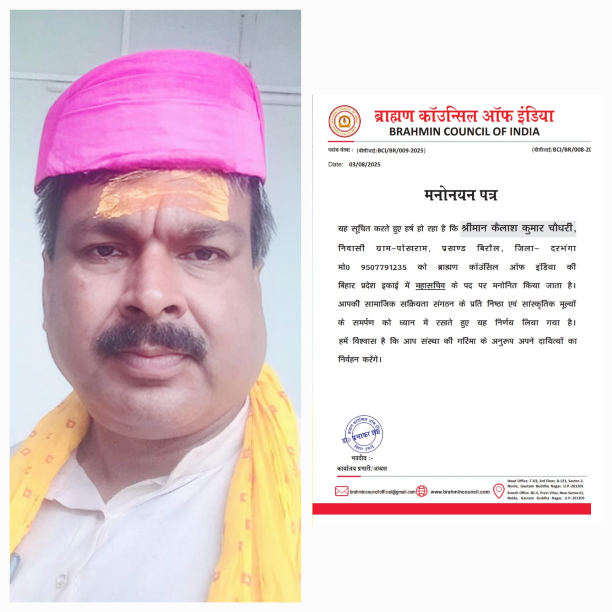 दरभंगा। ब्राह्मण काउंसिल ऑफ इंडिया, बिहार प्रदेश इकाई में संगठनात्मक विस्तार की प्रक्रिया तेज़ हो गई है। प्रदेश अध्यक्ष डॉ. प्रभाकर झा ने दरभंगा ज़िले के तीन प्रमुख सामाजिक कार्यकर्ताओं को महत्वपूर्ण जिम्मेदारियों से नवाज़ा है, जिससे संगठन में नई ऊर्जा और व्यापकता आने की उम्मीद जताई जा रही है।
