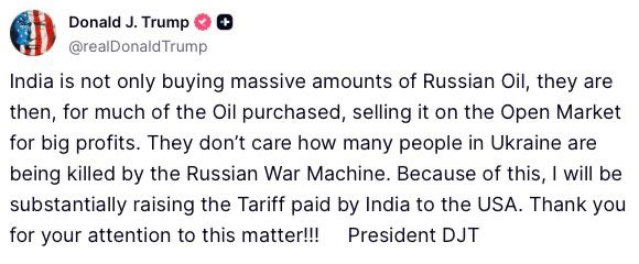 डेस्क : अमेरिका के राष्ट्रपति डोनाल्ड ट्रंप (Donald Trump) ने भारत पर टैरिफ बढ़ाने का ऐलान किया है. इस बार उन्होंने रूस से तेल की खरीद और उसकी आगे बिक्री को लेकर भारत पर निशाना साधा है. ट्रंप ने कहा है कि भारत रूसी तेल बड़े पैमाने पर खरीद रहा है और फिर उसे खुले बाजार में भारी मुनाफे में बेच रहा है. अपने सोशल मीडिया प्लेटफॉर्म Truth Social पर ट्रंप ने लिखा, “भारत सिर्फ रूसी तेल नहीं खरीद रहा, बल्कि उसका एक बड़ा हिस्सा खुले बाजार में मुनाफे के लिए बेच भी रहा है. उन्हें इस बात की कोई परवाह नहीं है कि रूस की इस युद्ध मशीन की वजह से यूक्रेन में कितने लोग मारे जा रहे हैं. इसी कारण मैं भारत पर लगने वाले टैरिफ को और बढ़ाने जा रहा हूं.”