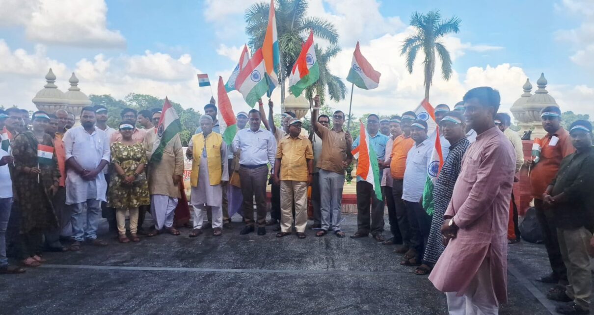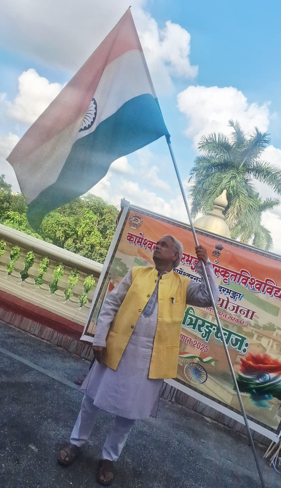 दरभंगा। देशव्यापी हर घर तिरंगा कार्यक्रम के तहत गुरुवार को संस्कृत विश्वविद्यालय में कई कार्यक्रम किये गए। कुलपति प्रो0 लक्ष्मी निवास पांडेय के नेतृत्व में सभी पदाधिकारियों व कर्मियों ने मुख्यालय भवन पर शान से तिरंगा लहराया और देश भक्ति के संदेश भी दिए। मौके पर डीन डॉ शिवलोचन झा,एफए इंद्र कुमार, कुलसचिव प्रो0 ब्रजेशपति त्रिपाठी, प्रो0 दिलीप कुमार झा, प्रो0 दयानाथ झा, डॉ सुधीर कुमार झा,एफओ जानकी रमन निधि, सीसीडीसी डॉ दिनेश झा, बजट पदाधिकारी डॉ पवन कुमार झा, डॉ रामसेवक झा, डॉ यदुवीर स्वरूप शास्त्री, डॉ साधना शर्मा, डॉ घनश्याम मिश्र समेत कई कर्मियों ने राष्ट्रीय ध्वज थामकर देश भक्ति के नारे लगाए। उक्त जानकारी देते हुए पीआरओ निशिकांत ने बताया कि इसके पूर्व राष्ट्रीय सेवा योजना स्नातकोत्तर इकाई द्वारा इस अवसर पर रंगोली, कविता, गीत व संगोष्ठी के माध्यम से भी देशभक्ति का भाव प्रकट किया गया। कैम्पस में ही तिरंगा लिए एक शोभा यात्रा भी निकाली गई।