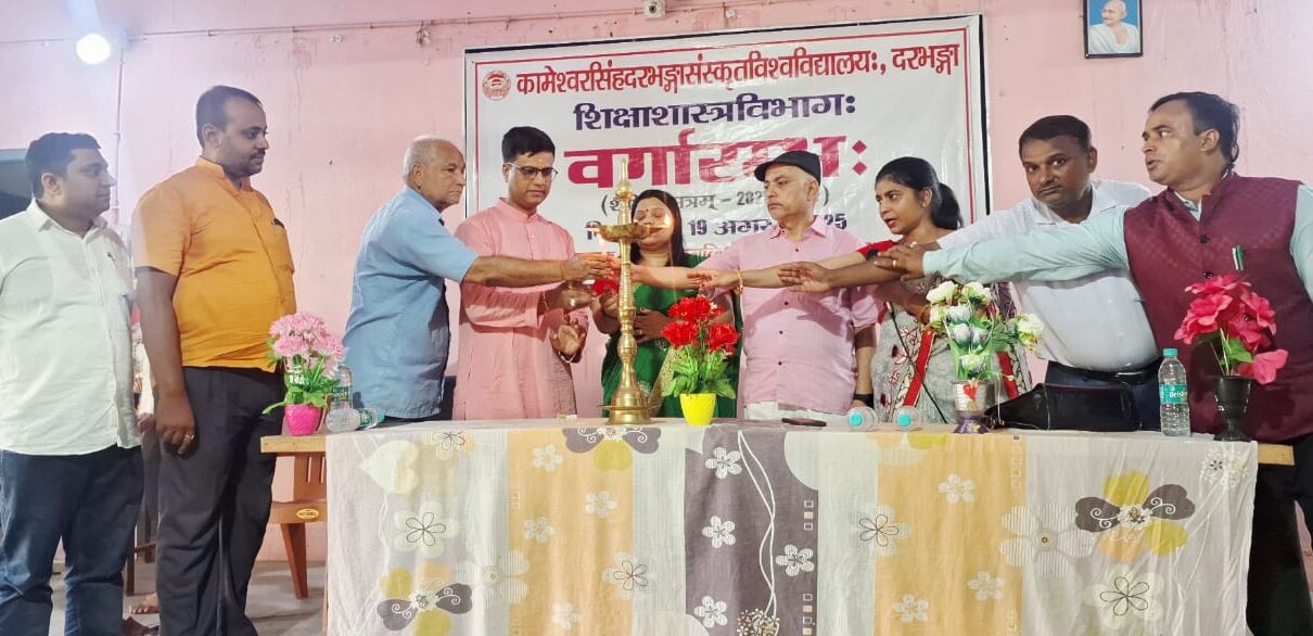 मंगलवार को कामेश्वर सिंह दरभंगा संस्कृत विश्वविद्यालय स्थित बहुद्देश्यीय सभा भवन में शैक्षिक सत्र 2025-27 में नूतन प्रविष्ट शिक्षाशास्त्री ( बीएड) छात्रों का वर्गारम्भ किया गया । विभागीय प्राध्यापकों एवं निर्देशक द्वारा दीप प्रज्ज्वलित कर कार्यरम्भ का विधिवत् शुरुआत की गई । अपने स्वागत उद्वोधन में शिक्षाशास्त्र विभाग के प्राध्यापक डॉ.रामसेवक झा ने कहा कि प्राच्य विद्या के संरक्षण में स्थापित इस संस्कृत विश्वविद्यालय का अपना गौरवमयी इतिहास रहा है । आप सभी छात्र भाग्यशाली है जो आपका चयन शिक्षाशास्त्र विभाग में हुआ है । यहां छात्र बीएड प्रशिक्षण के अलावा नैतिक मूल्यों,अनुशासन एवं आदर्श आचरण का ज्ञान हासिल कर सकेंगे ।