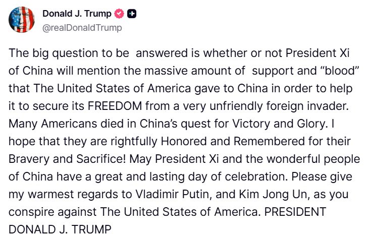 अंतरराष्ट्रीय ट्रंप ने चीन के विजय दिवस पर शी जिनपिंग पर किया कटाक्ष, चीन-रूस-उ. कोरिया पर अमेरिका के खिलाफ साजिश रचने का लगाया आरोप Posted on September 3, 2025September 3, 2025 Author admin Comment(0)