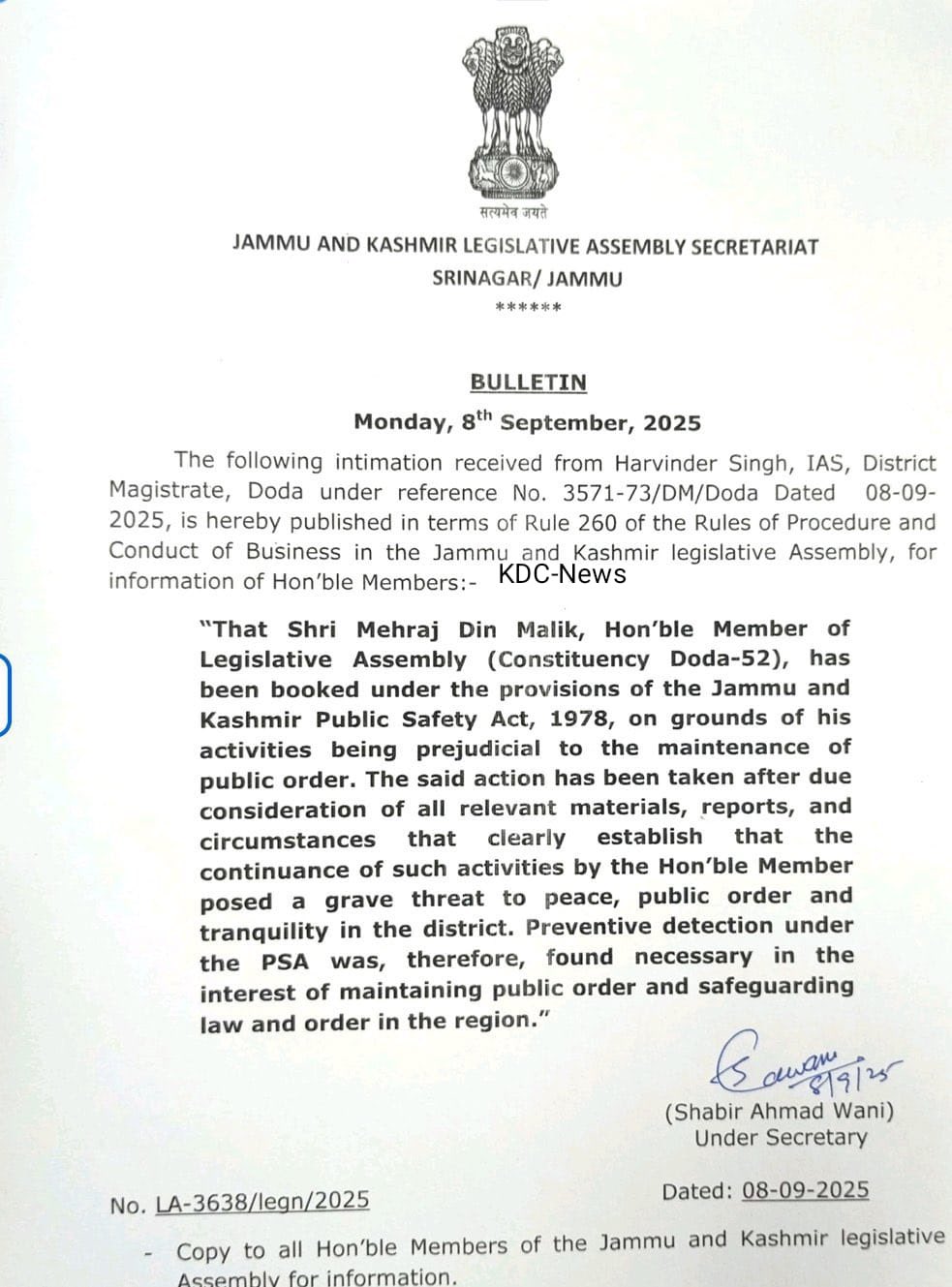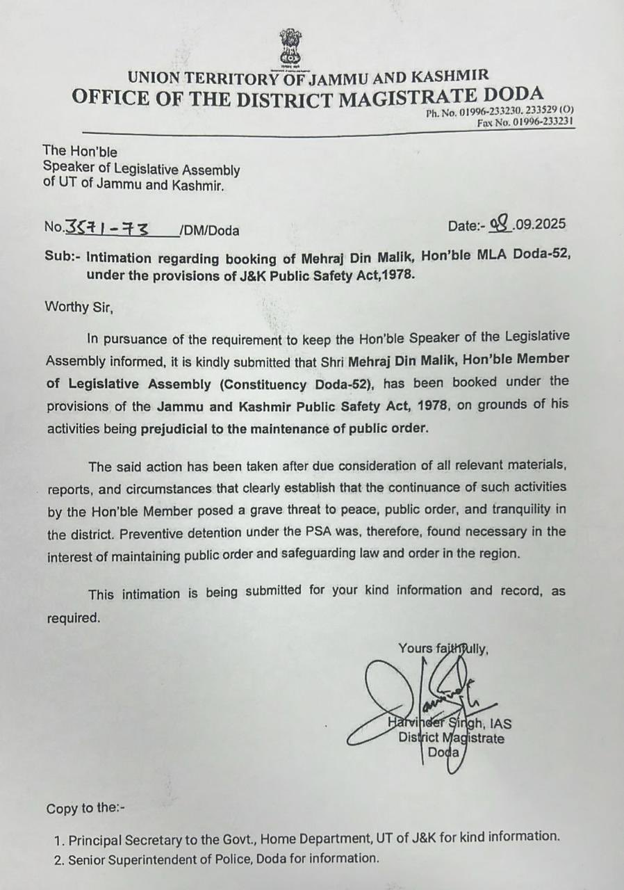 जम्मू-कश्मीर के डोडा-52 से आम आदमी पार्टी के विधायक मेहराज दीन मलिक को गिरफ्तार कर जन सुरक्षा अधिनियम (पीएसए) के तहत मामला दर्ज किया गया है। विधायक की गतिविधियों से जिले में शांति, सार्वजनिक व्यवस्था और सौहार्द को गंभीर खतरा होने के कारण यह कार्रवाई की गई है।