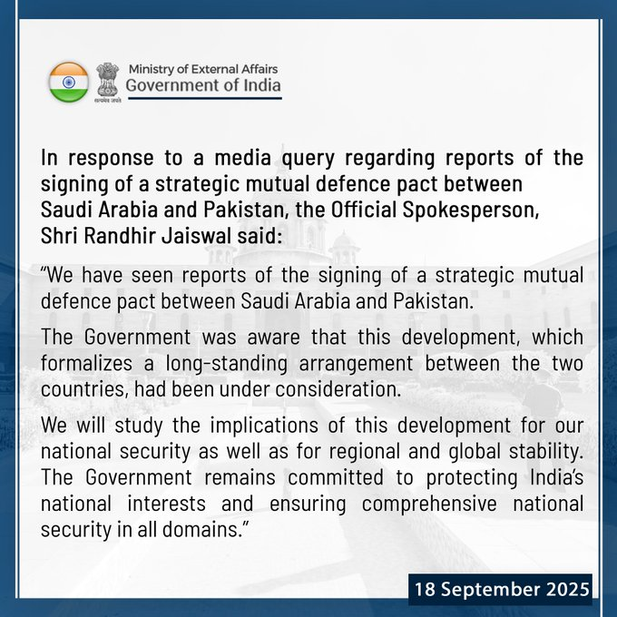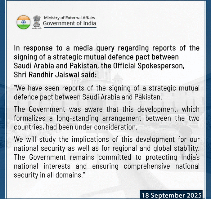 अंतरराष्ट्रीय सऊदी-पाकिस्तान रक्षा समझौते का अध्ययन कर रहा भारत Posted on September 18, 2025 Author admin Comment(0)