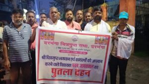 दरभंगा। भगवान चित्रगुप्त एवं कायस्थों के विरोध में दिए गए बयान के खिलाफ ढाका (मोतिहारी) के भाजपा विधायक, पवन जायसवाल का किया पुतला दहन चित्रगुप्त सभा दरभंगा के तत्वावधान में देर शाम नाका 5,कोतवाली चौक पर पुतला दहन किया गया। विधायक के खिलाफ आवश्यक कानूनी कार्रवाई करने सहित भारतीय जनता पार्टी से बर्खास्त करने की मांग की गई। पुतला दहन कार्यक्रम का नेतृत्व दरभंगा चित्रगुप्त सभा, दरभंगा के अध्यक्ष आर.के. दत्ता ने किया। मौके पर चित्रगुप्त सभा के प्रकाश चंद्र प्रभाकर, संतोष कुमार सिन्हा, संजय कुमार श्रीवास्तव,पुनीत कुमार सिन्हा,कमल कुमार श्रीवास्तव,संतोष कुमार श्रीवास्तव,शशिरंजन कर्ण, मुकेश कुमार सिंहा,नीरज कुमार दत्ता,आनंद कुमार, अजीत कुमार वर्मा,मनीष कुमार सहित कई चित्रांशगण उपस्थित थे।