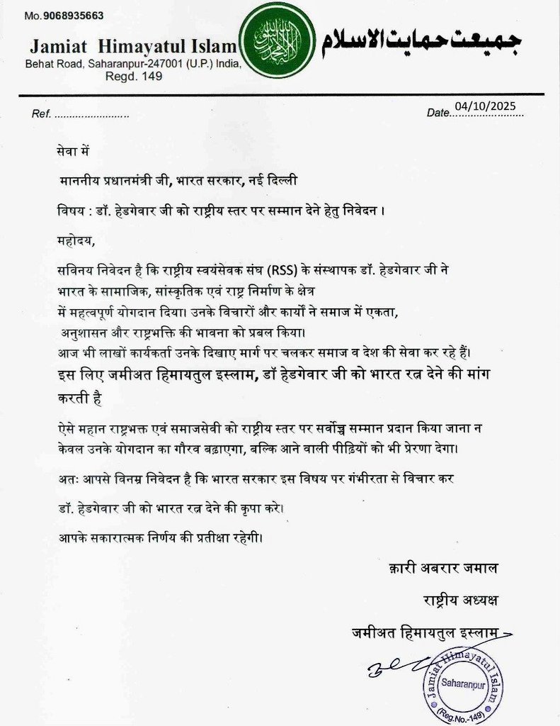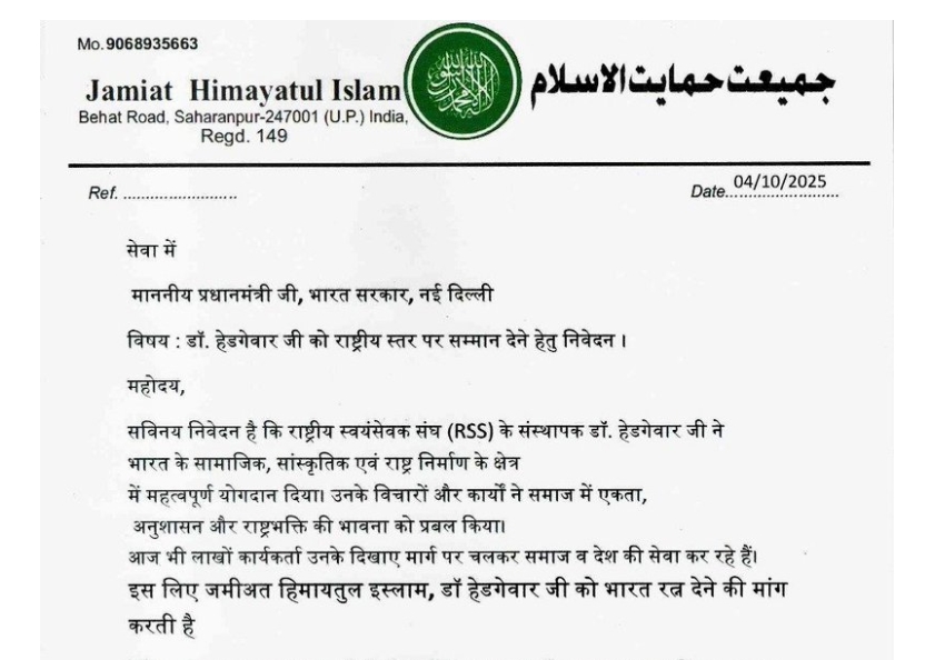 राष्ट्रीय जमीअत हिमायतुल इस्लाम ने पीएम मोदी को पत्र भेजकर की RSS संस्थापक डॉ. हेडगेवार को ‘भारत रत्न’ देने की मांग ! Posted on October 5, 2025 Author admin Comment(0)