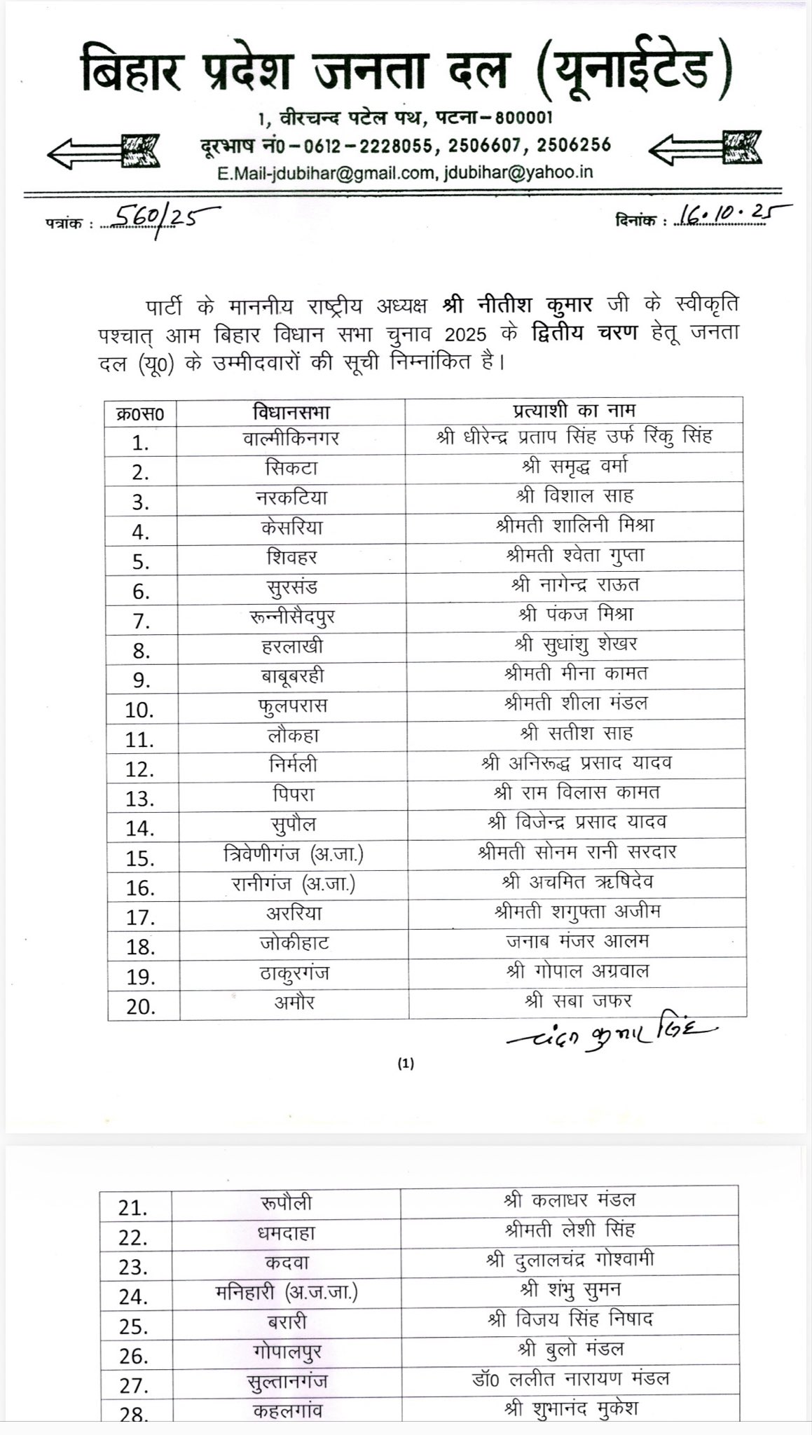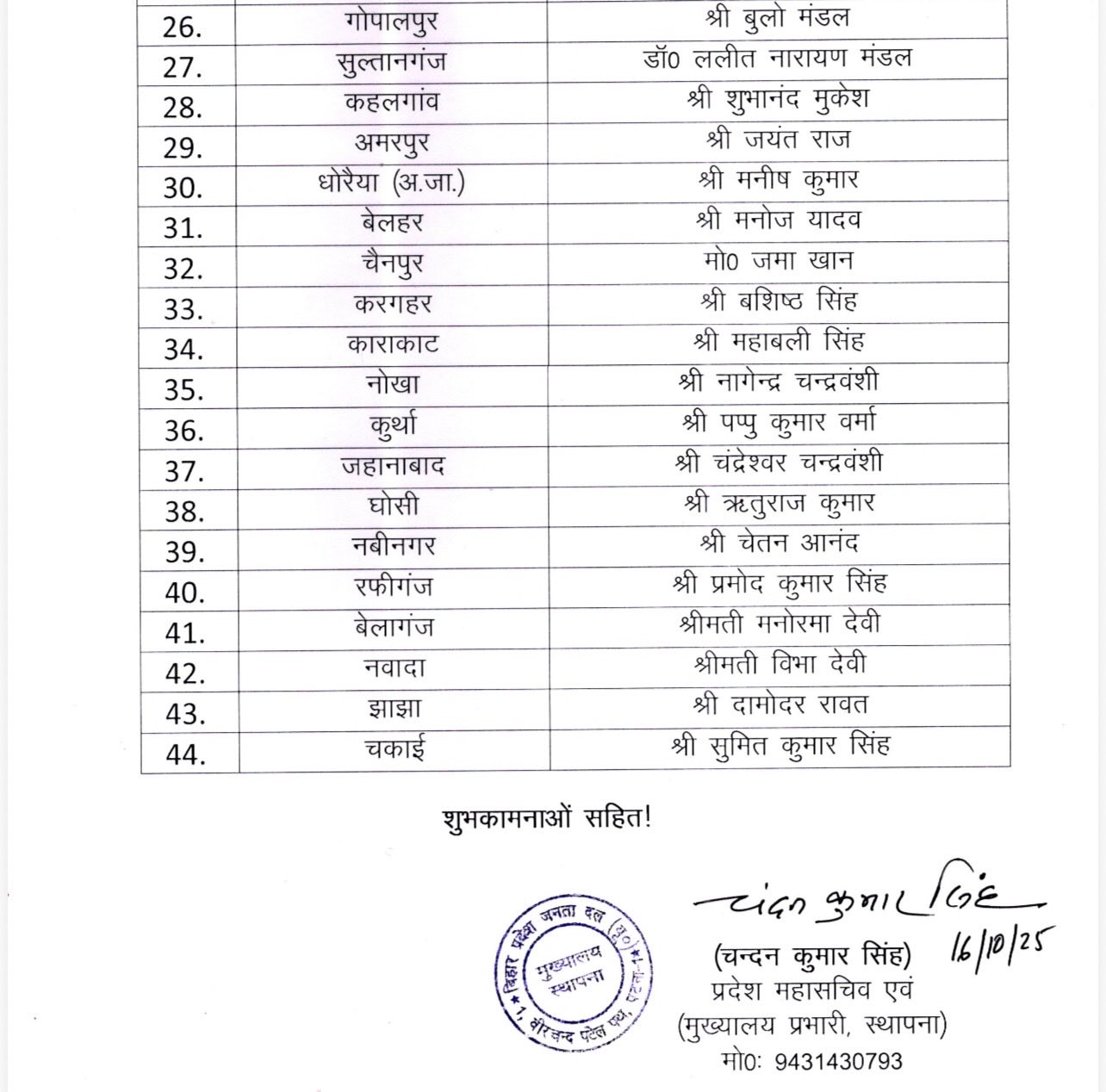 प्रादेशिक बिहार JDU की दूसरी लिस्ट जारी, 44 प्रत्याशियों के नाम शामिल, देखें सूची Posted on October 16, 2025 Author admin Comment(0)