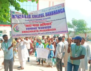 दरभंगा। मिथिला बी.एड कालेज,शोभन दरभंगा, द्वारा स्वच्छ भारत अभियान कार्यक्रम आयोजित किया गया। 2 अक्टूबर गांधी जयंती के अवसर से शुरू हुई जो 17 अक्टूबर तक चले। साल 2014 में 2 अक्टूबर को शुरू हुई स्वच्छ भारत अभियान आज पूरे देश में जन आंदोलन की तरह बन गया है। अभियान का मुख्य उद्देश्य देश को खुले में शौच से मुक्त बनाना,लोगों में स्वच्छता के प्रति जागरूकता पैदा करना था। छात्रों ने घूम-घूम कर लोगों को स्वच्छता अभियान के प्रति जागरूक किया गया। स्वच्छता अभियान में कॉलेज के सचिव, अंजार अहमद ने बताया पिछले दस वर्षों में गाँवों और शहरों में लाखों शौचालय बनाए गए हैं। स्कूलों और सार्वजनिक स्थानों पर सफाई व्यवस्था में भी उल्लेखनीय सुधार हुआ है। यह अभियान प्लास्टिक मुक्त भारत की दिशा में एक महत्वपूर्ण कदम साबित हुई है। मौके पर प्राचार्य वजीह अहमद खान ने कहा स्वच्छता केवल सरकार की ज़िम्मेदारी नहीं बल्कि प्रत्येक नागरिक का कर्तव्य है।