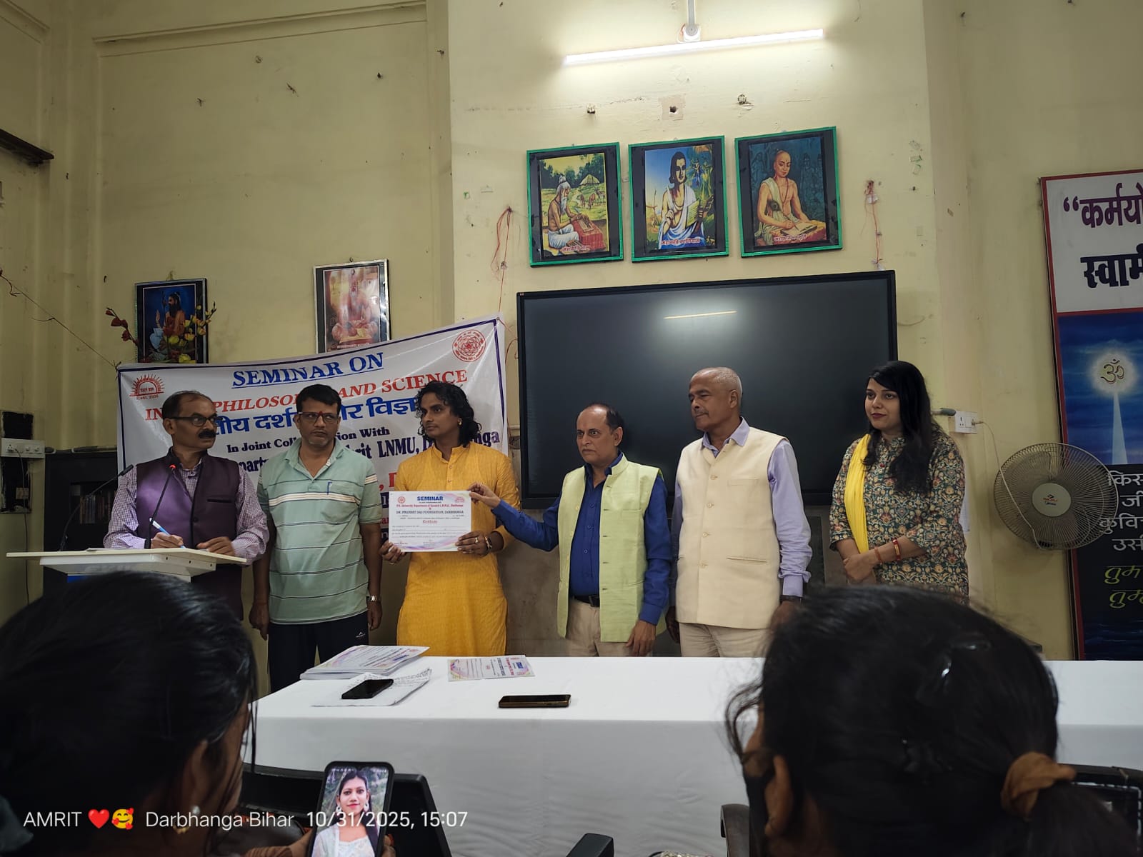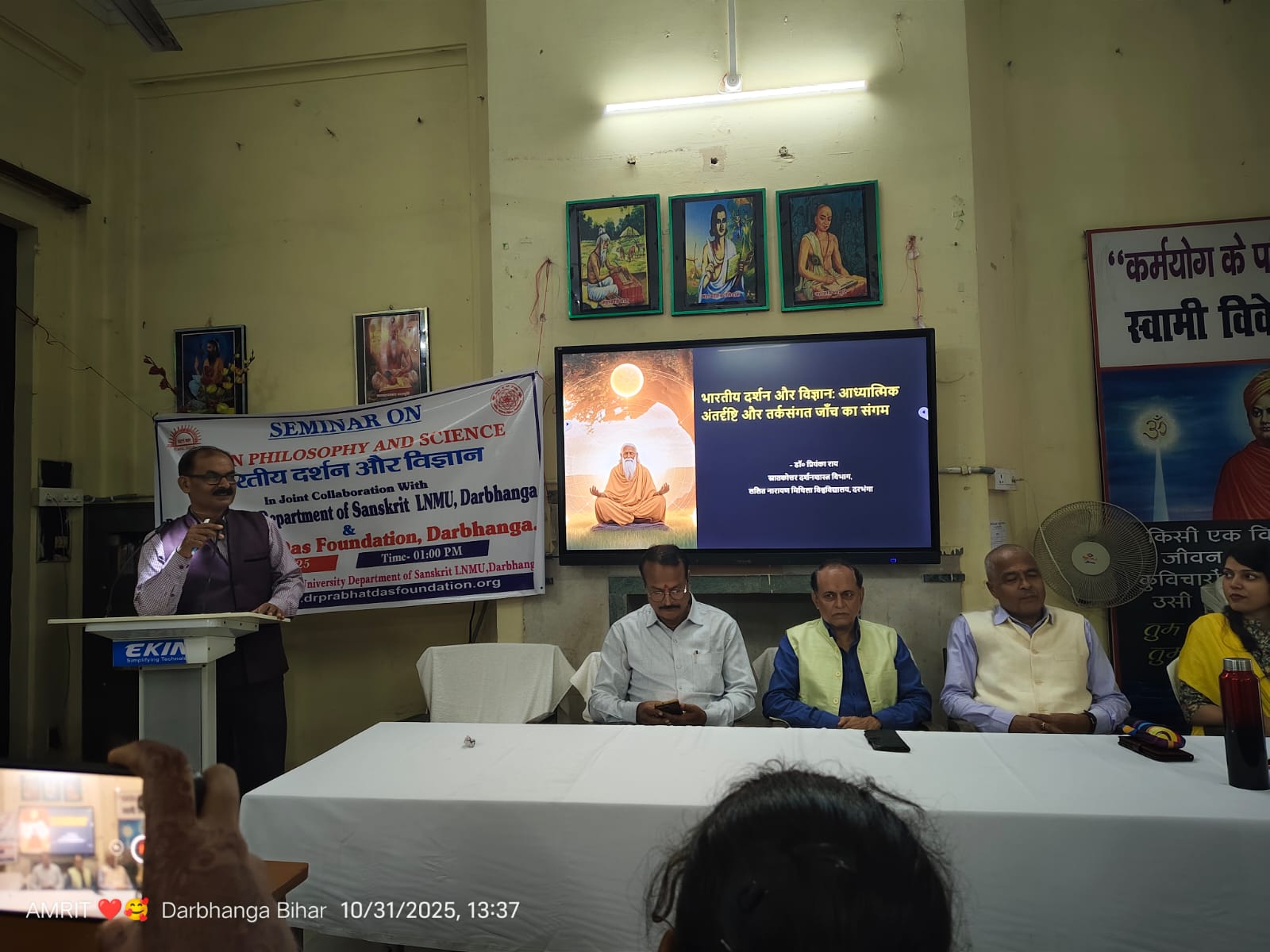 दरभंगा : ललित नारायण मिथिला विश्वविद्यालय, दरभंगा के स्नातकोत्तर संस्कृत विभाग तथा डॉ प्रभात दास फाउंडेशन, दरभंगा के संयुक्त तत्त्वावधान में “भारतीय दर्शन और विज्ञान” विषय पर पीजी संस्कृत विभाग में विभागाध्यक्ष डॉ कृष्णकान्त झा की अध्यक्षता में सेमिनार का आयोजन किया गया, जिसमें सीएमबी कॉलेज, घोघरडीहा, मधुबनी के प्रधानाचार्य प्रो जीवानन्द झा, विश्वविद्यालय दर्शनशास्त्र विभागाध्यक्ष डॉ शिवानन्द झा, दर्शनशास्त्र की प्राध्यापिका डॉ प्रियंका राय, संस्कृत-प्राध्यापक डॉ आर एन चौरसिया, फाउंडेशन के सचिव मुकेश कुमार झा, संस्कृत अध्ययन केन्द्र के शिक्षक अमित कुमार झा आदि ने अपने विचार रखें। सेमिनार का उद्घाटन अतिथियों द्वारा दीप प्रज्वलन से हुआ, जिसमें पीजी रसायनशास्त्र के प्राध्यापक डॉ सोनू राम शंकर, सब-डिविजनल डिग्री गवर्नमेंट कॉलेज, बेनीपुर, दरभंगा के शिक्षक डॉ मारुति नंदन भारद्वाज, डॉ संजय कुमार तथा डॉ चंदन कुमार, संस्कृत विश्वविद्यालय के शोधार्थी- राम सिया कुमारी तथा नेहा कुमारी सहित 60 से अधिक व्यक्ति उपस्थित थे, जिन्हें फाउंडेशन की ओर से प्रमाण पत्र प्रदान किया गया।