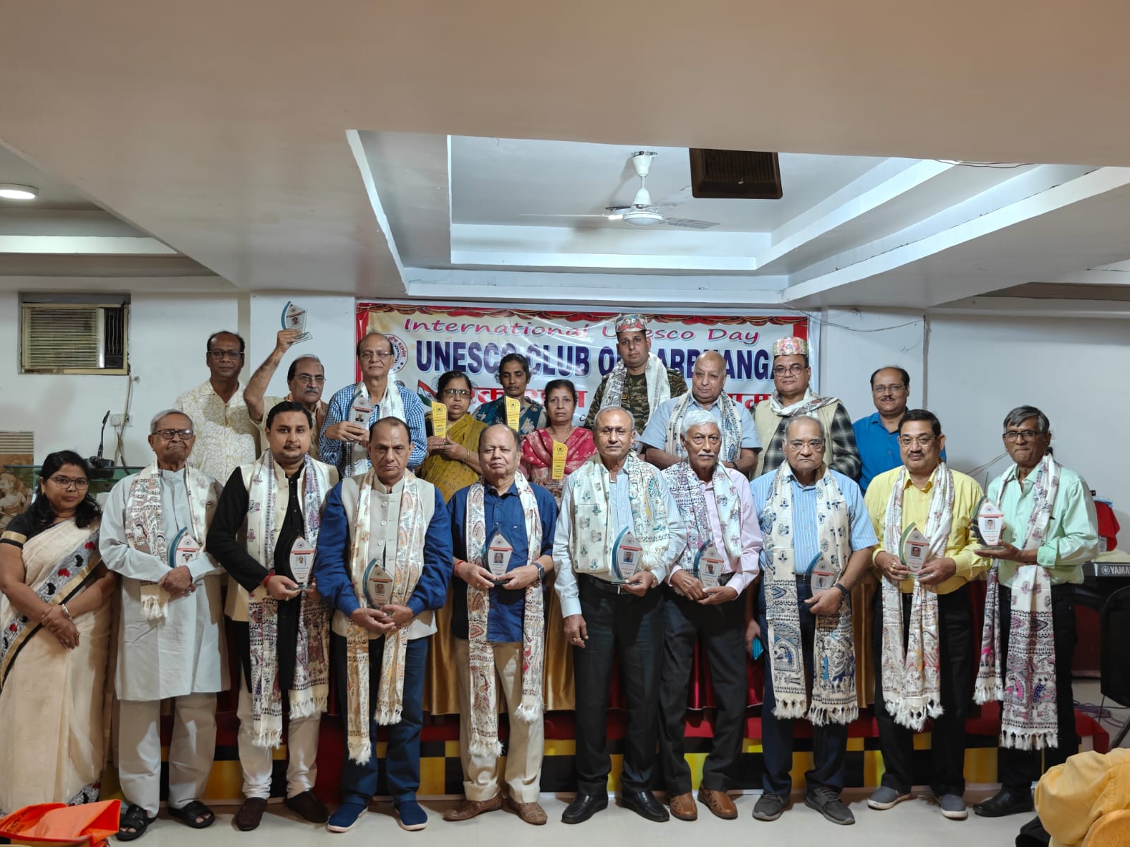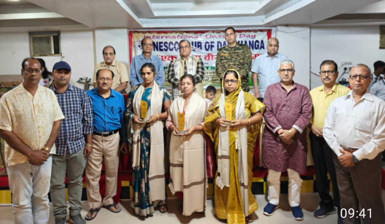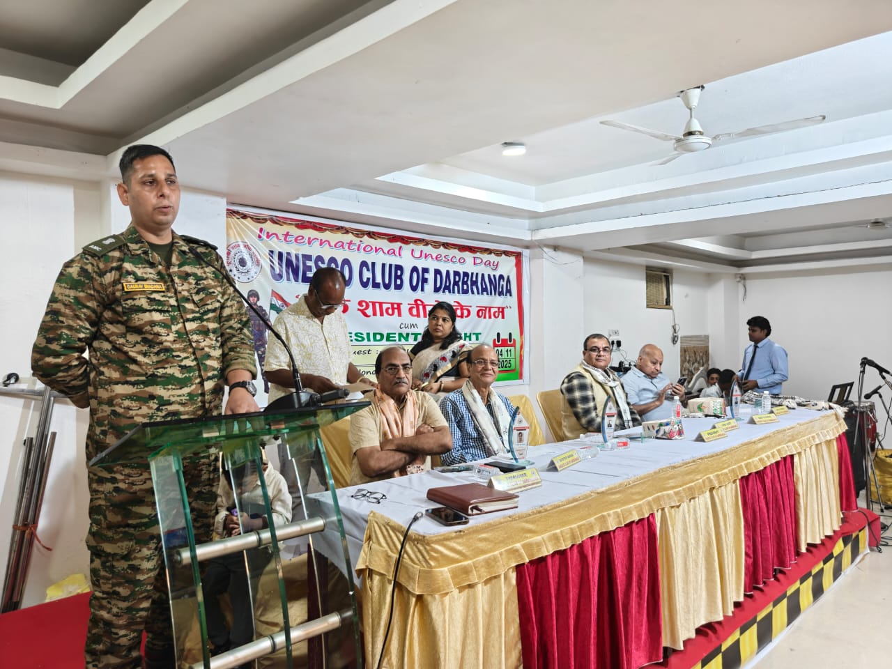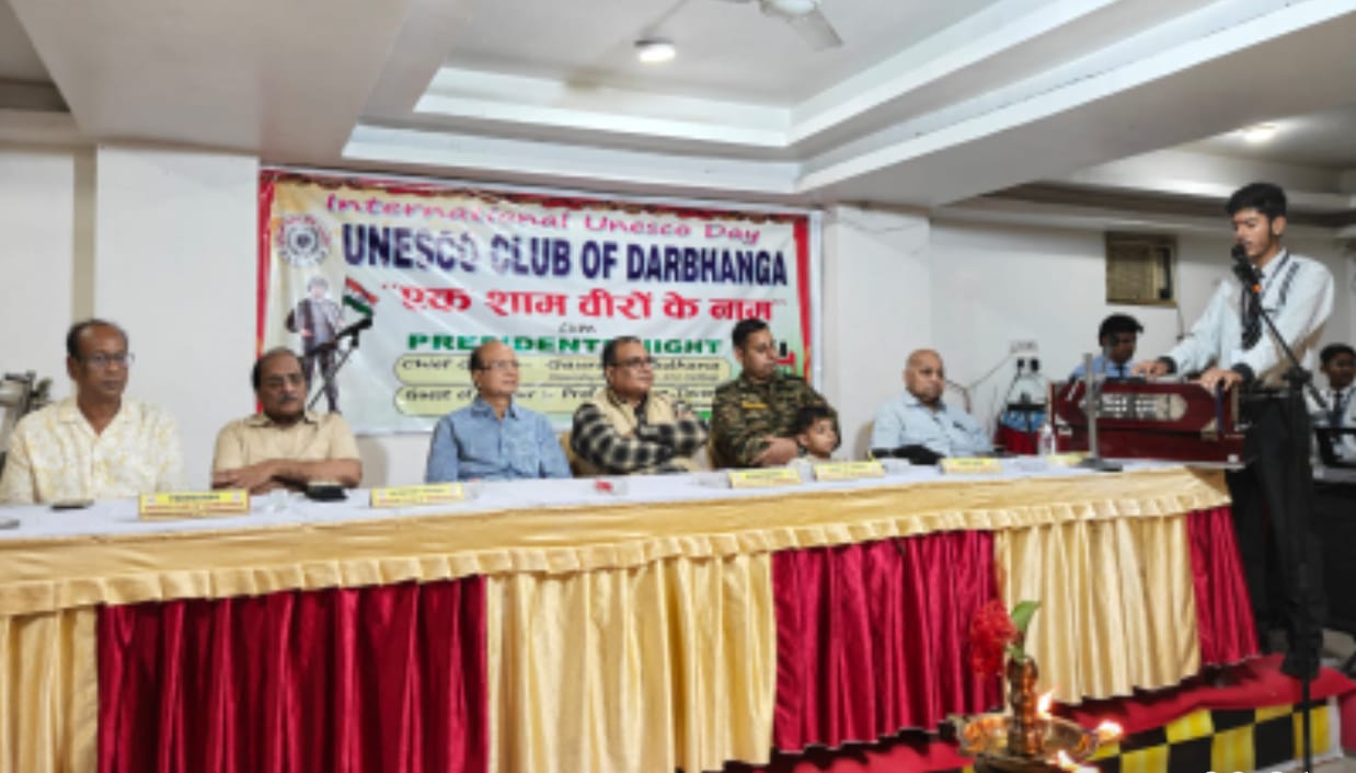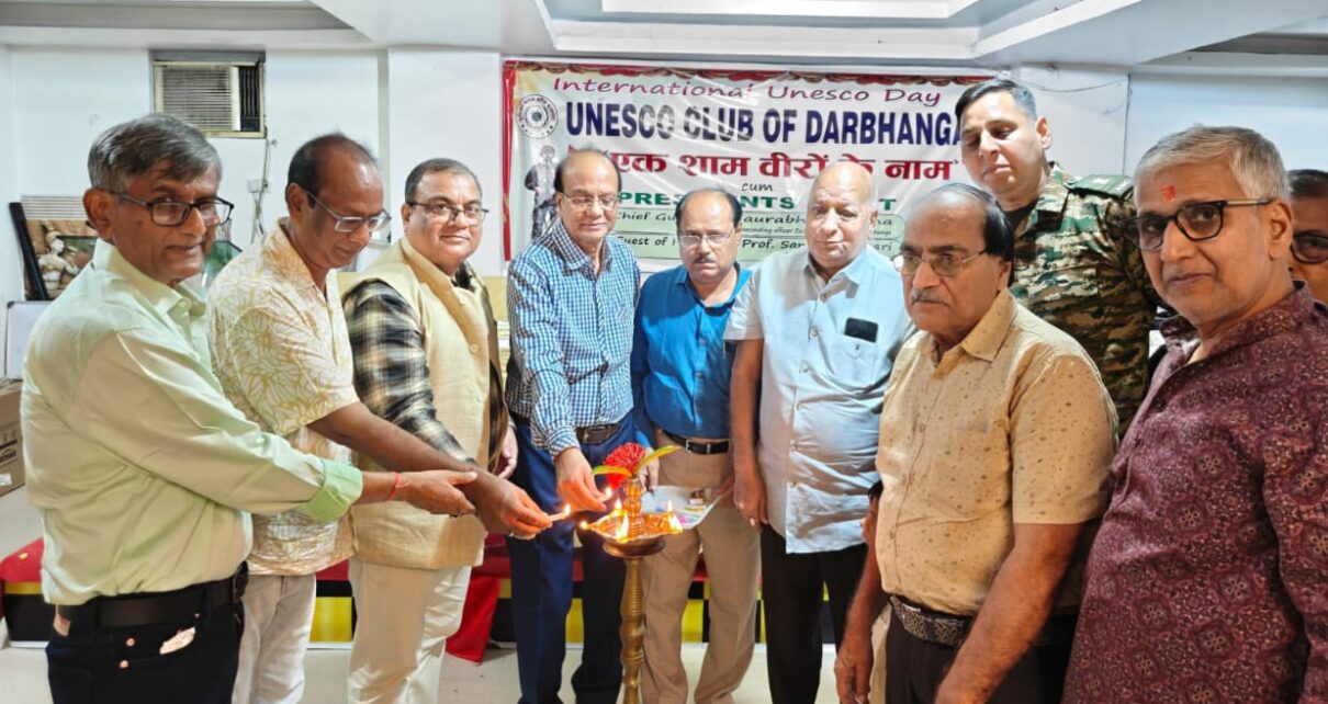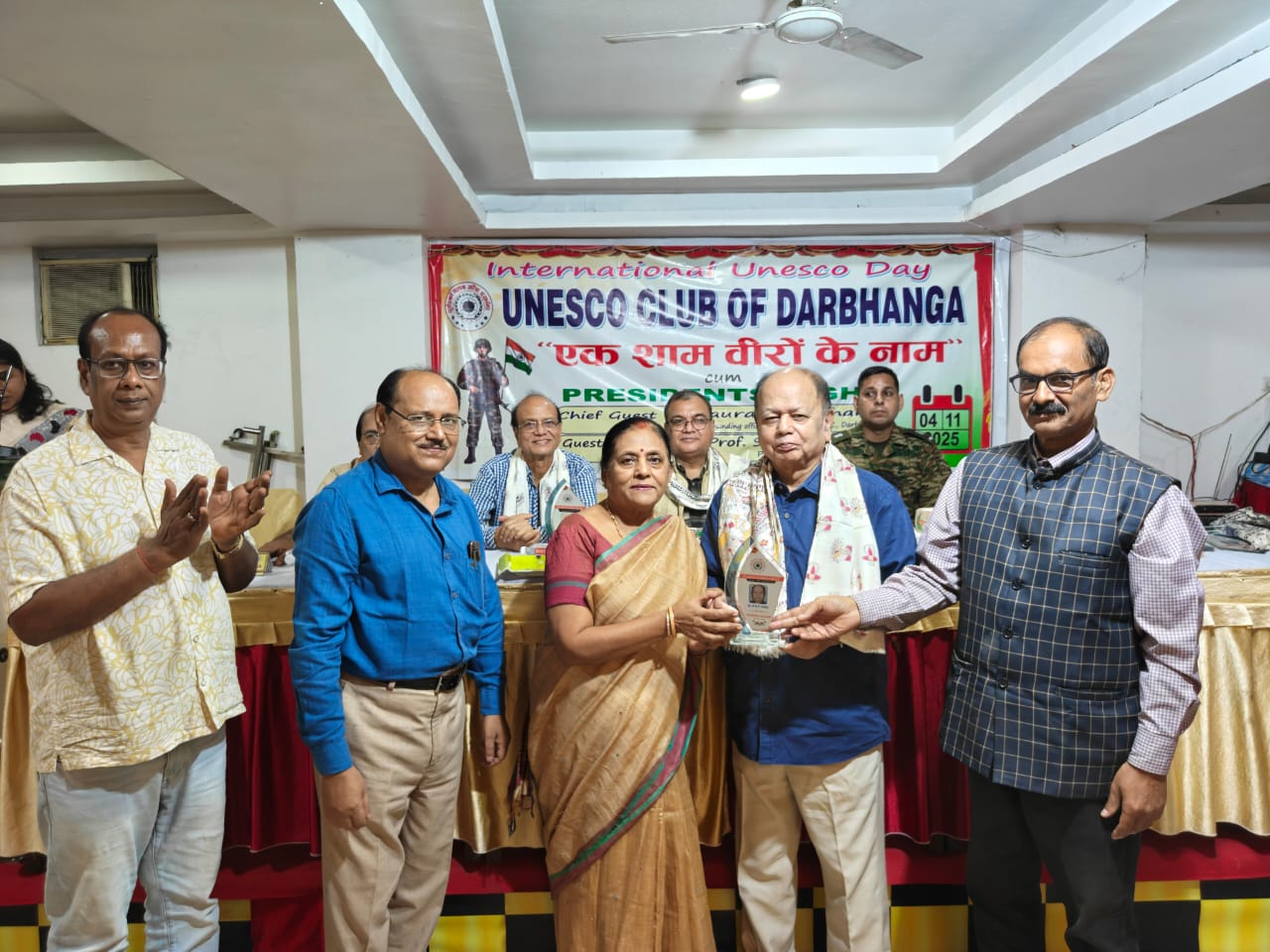 दरभंगा : इंटरनेशनल यूनेस्को डे पर यूनेस्को क्लब दरभंगा द्वारा “एक शाम वीरों के नाम सह पास्ट प्रेसिडेंट नाइट” कार्यक्रम का आयोजन किया गया। क्लब के अध्यक्ष बिनोद कुमार पंसारी की अध्यक्षता में श्रीकृष्णा रेजिडेंसी होटल, दरभंगा में आयोजित समारोह में मुख्य अतिथि के रूप में बटालियन 2, एनसीसी, दरभंगा के कमांडिंग ऑफिसर गौरव बधाना तथा सम्मानित अतिथि के रूप में इंजीनियरिंग कॉलेज ऑफ़ दरभंगा के प्रधानाचार्य प्रो संदीप तिवारी उपस्थित हुए, जिन्हें क्लब के सदस्यों द्वारा पाग, चादर एवं मोमेंटो से स्वागत किया गया। दीप प्रज्वलित कर शुभारंभ हुए कार्यक्रम में दरभंगा जूनियर पब्लिक स्कूल के छात्र-छात्राओं ने स्वागत, राष्ट्रभक्ति एवं सैनिकों के सम्मान में अनेक मधुर गीत प्रस्तुत किया, जबकि दरभंगा सेन्ट्रल स्कूल के छात्र-छात्राओं ने राष्ट्रगीत एवं मिथिला संस्कृति पर आधारित लोकगीतों पर मोहक डांस प्रस्तुत किया। देश के लिए अपने प्राण न्योछावर करने वाले अमर शहीदों की वीरांगना कामिनी कुमारी को नीलम पंसारी, नीलम देवी को नीलम अग्रवाल तथा अनीता देवी को सुगंधा चौधरी द्वारा क्लब की ओर से चादर, मोमेंटो तथा गिफ्ट पैकेट प्रदान कर सम्मानित किया गया।