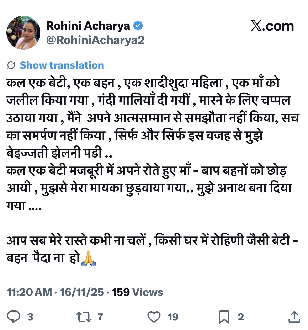 प्रादेशिक बिहार गंदी गालियां दी गईं, मारने के लिए चप्पल उठाया गया… : रोहिणी आचार्य Posted on November 16, 2025 Author admin Comment(0)