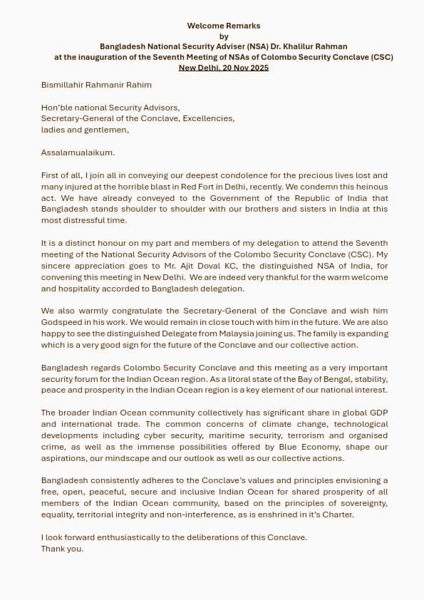 अंतरराष्ट्रीय लाल किला धमाके से हम गहराई से दुःखी हैं, बांग्लादेश भारत के साथ कंधे से कंधा मिलाकर खड़ा है : NSA खलीलुर रहमान Posted on November 20, 2025 Author admin Comment(0)
