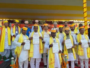 दरभंगा। बिहार के राज्यपाल सह कुलाधिपति, आरिफ मोहम्मद खान की अध्यक्षता में डॉ नागेन्द्र झा स्टेडियम में ललित नारायण मिथिला विश्वविद्यालय, दरभंगा के आयोजित 11वें दीक्षांत समारोह में 25 टॉपर छात्रों तथा एक ओवर ऑल टॉपर सहित 26 गोल्ड मेडलिस्ट, 80 पीएच डी धारी सहित करीब 1200 छात्र- छात्राओं को डिग्रियां प्रदान की गई। समारोह में दीक्षांत वक्ता के रूप में शिक्षा संस्कृति उत्थान न्यास, नई दिल्ली के राष्ट्रीय सचिव डॉ अतुल कोठारी, सम्मानित अतिथि के रूप में आईआईटी, पटना के निदेशक प्रो टी एन सिंह तथा विशिष्ट अतिथि के रूप में राज्यपाल के प्रधान सचिव रॉबर्ट एल चोंग्थु उपस्थित रहे। सर्वप्रथम विद्वत शोभा यात्रा निकाली गई, जिसमें कुलाधिपति सहित कुलपति, पूर्व कुलपति, कुलसचिव, संकायाध्यक्ष, सीनेट, सिंडिकेट तथा विद्वत परिषद् के सदस्यों ने भाग लिया। राष्ट्रगान, विश्वविद्यालय कुलगीत तथा कन्वोकेशन बैण्ड की प्रस्तुति विश्वविद्यालय संगीत एवं नाट्य विभाग के छात्र-छात्राओं द्वारा प्रस्तुत किया गया। मुख्य कन्वोकेशन का संचालन कुलसचिव डॉ दिव्या रानी हांसदा ने किया। अन्य भागों का संचालन डॉ प्रियंका राय, डॉ रश्मि कुमारी तथा नेहा कुमारी ने संयुक्त रूप से किया। लनामिविवि के पूर्व कुलपति, प्रो. राजमणि प्रसाद सिन्हा को भौतिकी के क्षेत्र में विशिष्ट उपलब्धि तथा प्रो. समरेन्द्र प्रताप सिंह को चिकित्सा क्षेत्र में विशिष्ट उपलब्धि के लिए डॉक्टर ऑफ साइंस की मानद उपाधि कुलाधिपति ने प्रदान किया। दीक्षांत वक्ता डॉ अतुल कोठारी ने कहा आज का दिन सभी उपाधि धारकों के जीवन का स्वर्णिम दिन है। नैपुण्य प्राप्ति के बाद छात्र अपने ज्ञान का व्यावहारिक उपयोग करेंगे। शिक्षा छात्रों के भावी जीवन को तैयार करती है। राष्ट्रीय शिक्षा नीति-2020 में कला, खेल, संस्कृति, कौशल विकास आदि को अधिक महत्व दिया गया है। उन्होंने कहा कि भारतीय शिक्षा का उद्देश्य चरित्र निर्माण तथा व्यक्तित्व का सर्वांगीण विकास है। हमें शिक्षा के स्वरूप एवं शोध प्रक्रिया में परिवर्तन करना होगा। तभी भारतीय ज्ञान-परंपरा समृद्ध होगी और भारत विश्व गुरु बनेगा। सम्मानित अतिथि प्रो टी एन सिंह ने कहा कि दीक्षांत छात्रों एवं विश्वविद्यालय को अपने-आप के मूल्यांकन का दिन होता है। सूर्य की तरह प्रकाशमान बनने के लिए तपना भी पड़ता है। छात्र अपने माता-पिता एवं शिक्षकों की अपेक्षाओं को पूरा करें, क्योंकि ये हमेशा उन्हें आगे बढ़ते देखना चाहते हैं। विश्वविद्यालय का उद्देश्य अच्छे व्यक्तियों का निर्माण करना होता है। उन्होंने कहा कि मिथिला विश्वविद्यालय दिन प्रतिदिन उत्तरोत्तर विकास कर रहा है, जिसके लिए कुलपति, शिक्षक, पदाधिकारी, कर्मचारी एवं छात्र-छात्राएं ब