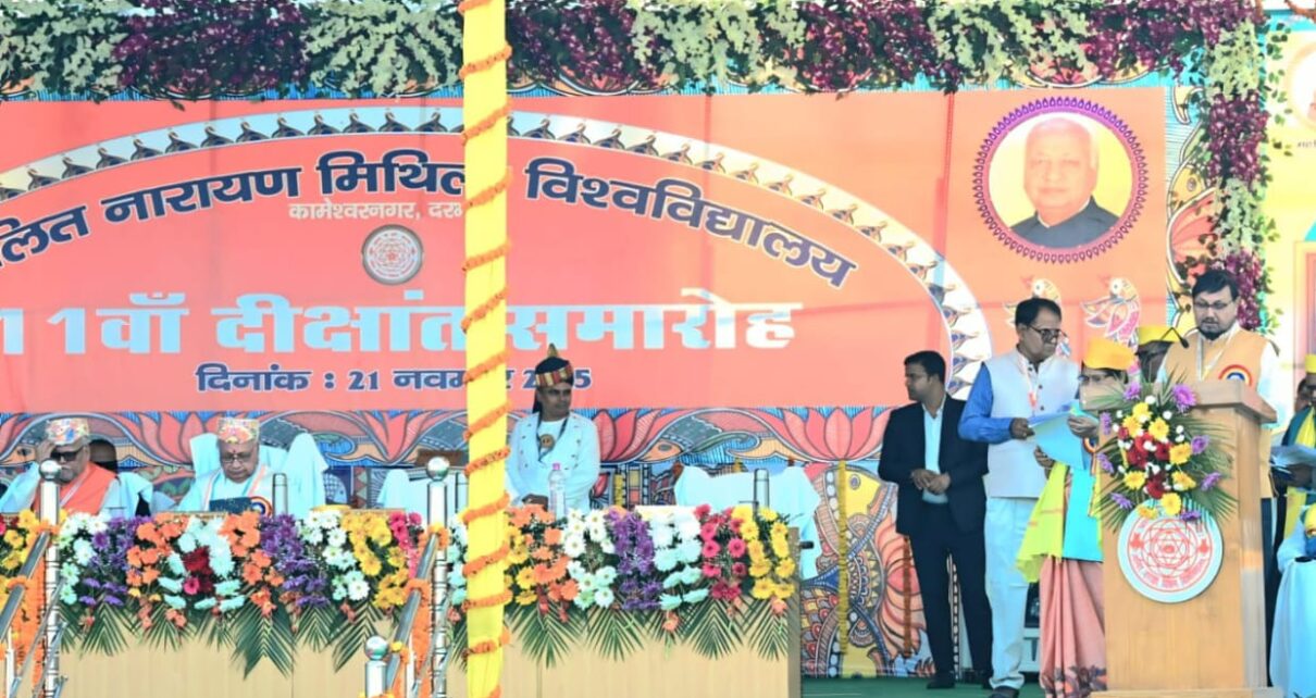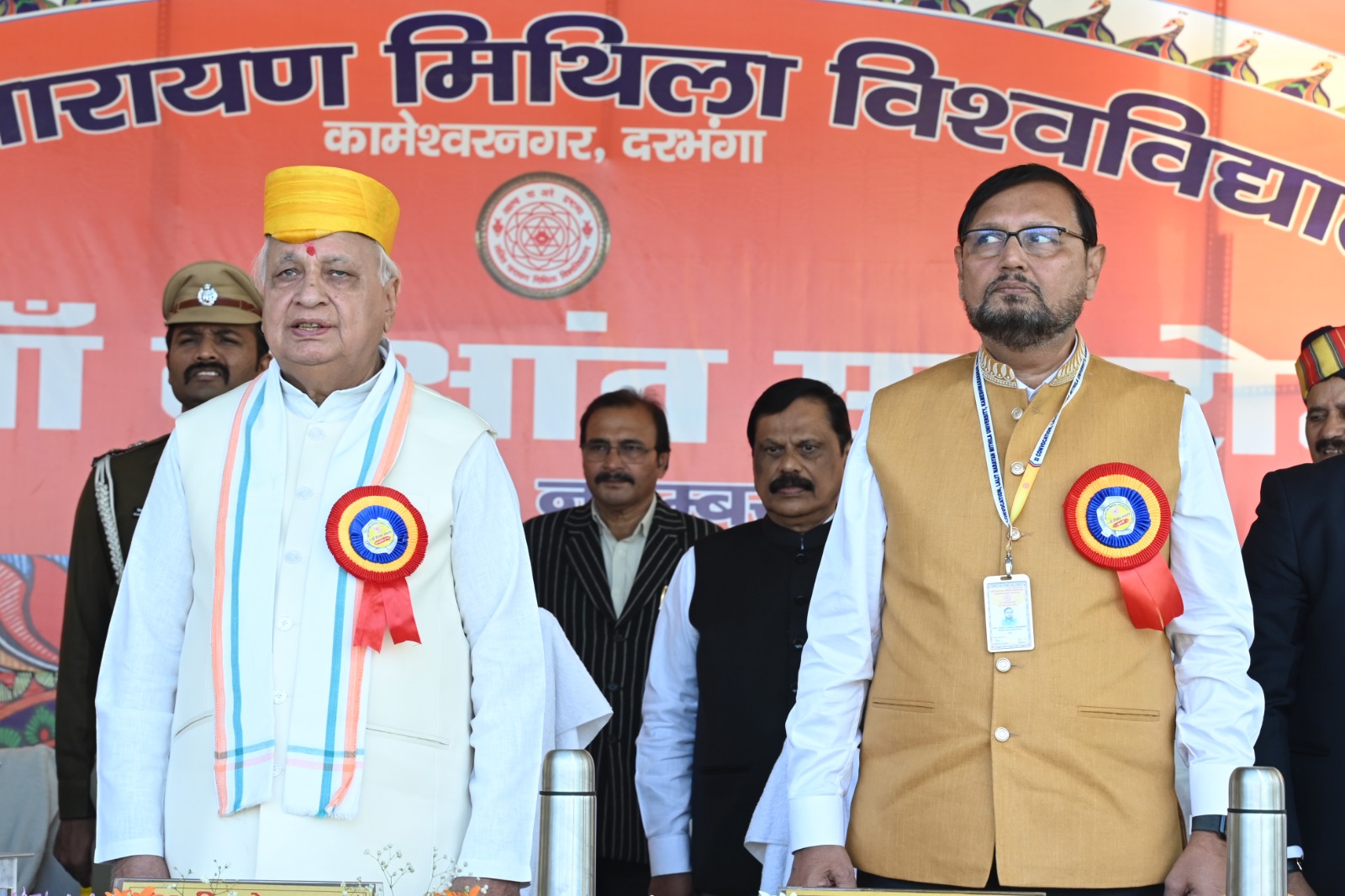 दरभंगा : ललित नारायण मिथिला विश्वविद्यालय, दरभंगा का 11वां दीक्षांत समारोह संपन्न हुआ, जिसमें कई नामचीन व्यक्तियों की सहभागिता हुई। समारोह की अध्यक्षता बिहार के राज्यपाल सह कुलाधिपति आरिफ मोहम्मद खां ने की, जबकि मुख्य वक्ता के रूप में शिक्षा संस्कृति उत्थान न्यास, नई दिल्ली के राष्ट्रीय सचिव डॉ अतुल कोठारी, सम्मानित अतिथि के रूप में आईआईटी, पटना के निदेशक प्रो टी एन सिंह, विशिष्ट अतिथि राज्यपाल के प्रधान सचिव रॉबर्ट एल चोंग्थु उपस्थित हुए। स्वागत संबोधन में विश्वविद्यालय के कुलपति प्रोफेसर संजय कुमार चौधरी ने कहा कि कुलाधिपति के कुशल नेतृत्व में हमारा विश्वविद्यालय नित्य नए-नए आयाम को प्राप्त कर रहा है और शैक्षणिक माहौल में भी तेजी से सुधार रहा है। हमारे विश्वविद्यालय के सभी सत्र नियमित हैं तथा ससमय परीक्षाफल का प्रकाशन भी हो रहा है। नियमित नियुक्ति से शिक्षकों की काफी हद तक कमी दूर हुई है। वही कुलाधिपति के निर्देश पर अतिथि शिक्षकों की नियुक्ति से शिक्षा में गुणात्मक सुधार हो रहा है। 4 वर्षीय स्नातक प्रथम सेमेस्टर सीबीसीएस के तहत 2025-29 में कुल 1,62,500 छात्र-छात्राओं ने नामांकन लिया है। यह बिहार का एकमात्र विश्वविद्यालय है, जिसने नैक के तृतीय चरण को सफलता पूर्वक करते हुए 2023 में बी प्लस प्लस ग्रेड प्राप्त किया है, जिसे 2024 में पीएम उषा के तहत शोध विश्वविद्यालय का दर्जा मिला है। यह बिहार का पहला विश्वविद्यालय है, जहां फोरेंसिक प्रयोगशाला की स्थापना हो रही है। 2025 में आइक्यूएसी द्वारा एनएडी पोर्टल (डिजिलॉकर)पर अंक पत्र, औपबंधिक प्रमाण पत्र तथा मूल प्रमाण पत्र अपलोड करने वाला यह बिहार राज्य में अग्रणी विश्वविद्यालय है। उन्होंने बताया कि पूरे विश्वविद्यालय में कार्यरत शिक्षकों एवं शिक्षकेत्तर कर्मियों का संक्षिप्त प्रोफाइल समर्थ पोर्टल पर अपलोड कर दिया गया है। विश्वविद्यालय को गुणवत्तापूर्ण शिक्षा का केन्द्र बनाने के लिए हमने 2024 में जननायक चन्द्रशेखर विश्वविद्यालय, बलिया, 2025 में महात्मा गांधी काशी विद्यापीठ, वाराणसी के साथ एमओयू हस्ताक्षर किया है तथा आईआईटी, पटना के साथ एमओयू की प्रक्रिया अंतिम चरण में है।