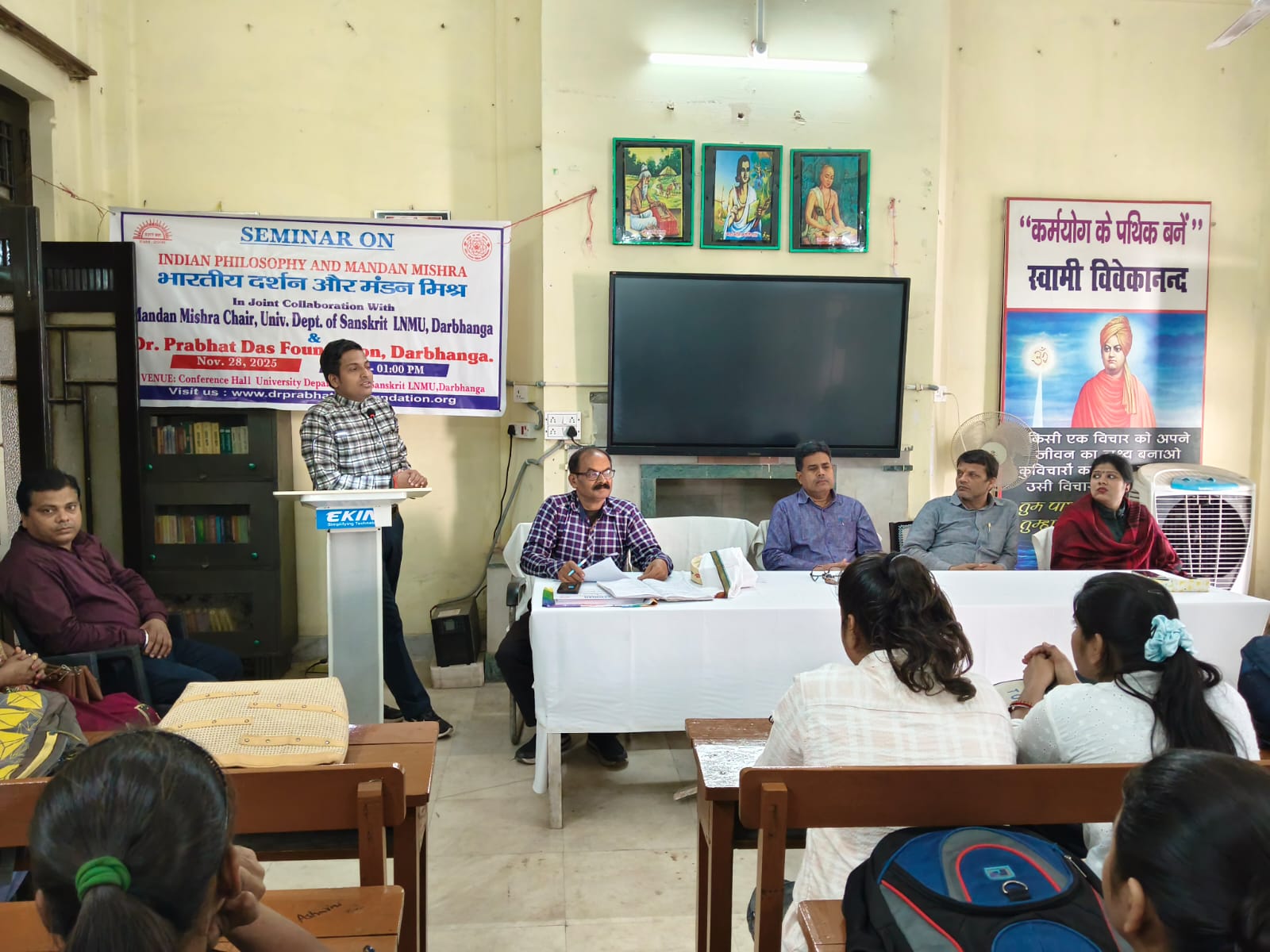 मंडन मिश्र पीट के समन्वयक एवं सेमिनार के संयोजक डॉ. आरएन चौरसिया ने विषय प्रवेश करते हुए कहा कि मिथिला भारत के प्राचीनतम ज्ञान केन्द्रों में से एक रहा है। जहां शास्त्रार्थ में भारती जैसी विदुषी का निर्णायक होना मिथिला की श्रेष्ठ ज्ञान-परंपरा में स्त्री विद्वता की सशक्त भूमिका को दर्शाता है। मंडन मिश्र ने तर्क और भाष्य शैली को सुगठित रूप से प्रस्तुत किया और मीमांसा-वेदान्त के जटिल विषयों को सरल एवं प्रभावी रूप से व्यक्त किया। कहा कि मंडन मिश्र का व्यक्तित्व और कार्य मिथिला की शैक्षणिक परंपरा के मूल स्तंभ माने जाते हैं। उनके विचारों ने मीमांसा को वेदांत से जोड़ा, जहां कर्म ज्ञान के सहायक माने गए। उनके योगदान ने भारतीय दर्शन में कर्म-ज्ञान संवाद को समृद्ध किया। अध्यक्षीय संबोधन में पूर्व संस्कृत विभागाध्यक्ष डॉ घनश्याम महतो ने मंडन मिश्र पीठ के उद्देश्यों पर प्रकाश डालते हुए कहा कि मिथिला के दार्शनिकों में मंडन मिश्र का नाम विशेष आदर से लिया जाता है। वे न केवल मीमांसा और वेदांत के मर्मज्ञ विद्वान थे, बल्कि मिथिला की बौद्धिक संस्कृति के प्रतिनिधि भी माने जाते हैं।