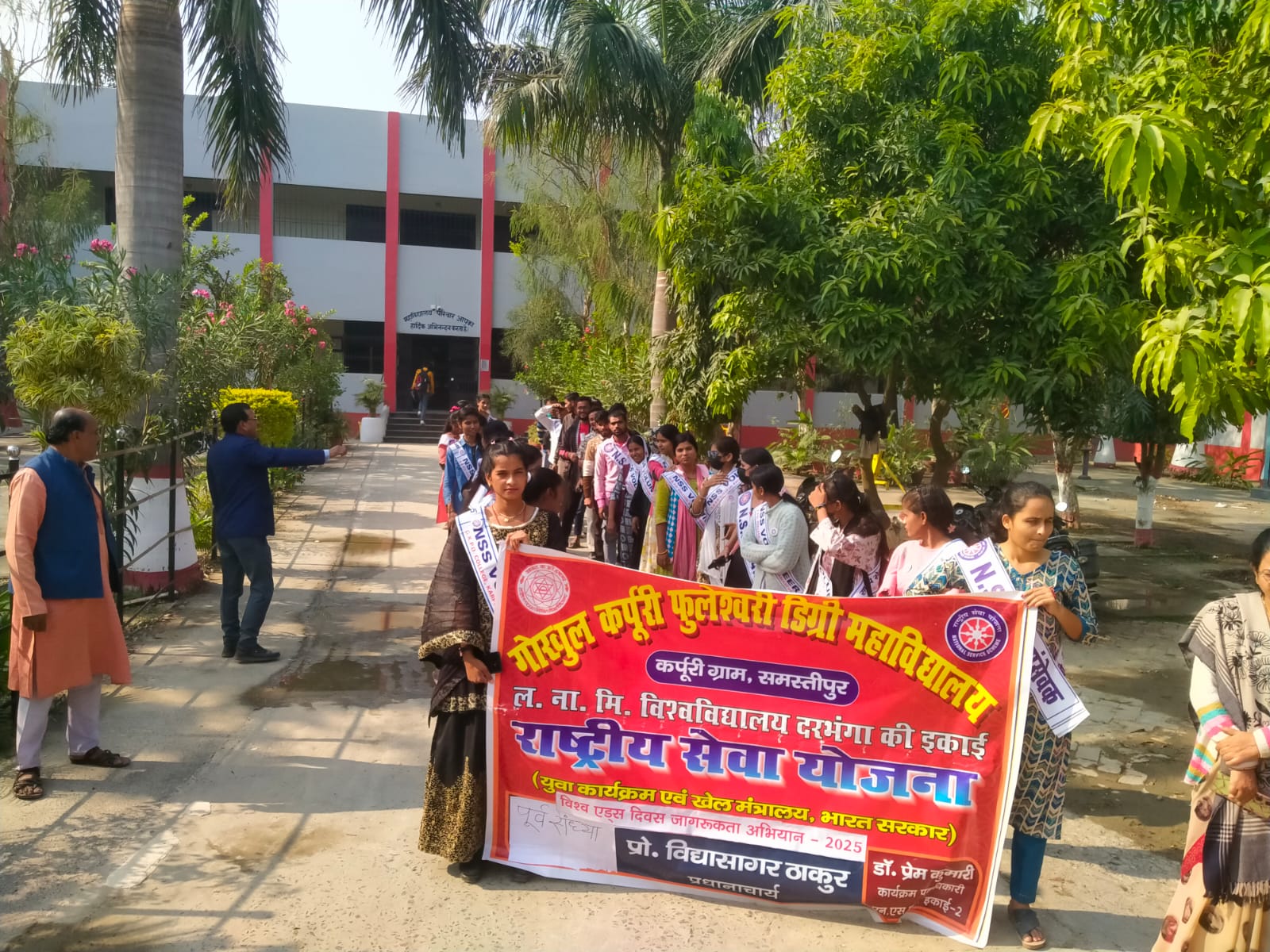 एनएसएस इकाई-2 के कार्यक्रम पदाधिकारी डॉ. प्रेम कुमारी के नेतृत्व में स्वयंसेवकों ने एड्स जागरूकता रैली निकाली जो समस्तीपुर नगर निगम के वार्ड नंबर-29 स्थित इकाई द्वारा गोद लिए गए मोहल्ले सलेमपुर में तथा कर्पूरीग्राम स्टेशन पर जाकर आमलोगों को एचआईवी एवं एड्स फैलने के कारणों, दुष्प्रभावों एवं बचाव के उपाय से घर-घर जाकर अवगत कराया। डॉ प्रेम कुमारी ने कहा कि एड्स फालने के चार कारणों में मुख्य रूप से असुरक्षित यौन संबंध बड़ा कारण है। इसकी सही और पूरी जानकारी देकर लोगों के बहुमूल्य जीवन को बचाया जा सकता है। इसके लिए सूचना, शिक्षा तथा जन जागरूकता आवश्यक है। उन्होंने बताया कि ‘एक पत्नी और एक पति व्रत’ का ईमानदारी से पालन करने से एड्स से समाज को बचाया जा सकता है