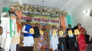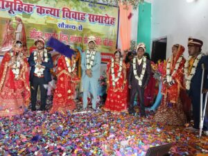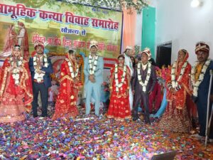 दरभंगा। अखिल भारतीय हिंदू जागरण सेवा समिति के नेतृत्व में श्यामा माई मंदिर परिसर स्थित विवाह भवन पर 6 जोड़े लड़का लड़की के सामूहिक विवाह का हुआ आयोजन। 7 जोड़े में 6 हुई इस सामूहिक विवाह कार्यक्रम में शामिल। हनुमान पूजन सामूहिक हनुमान चालीसा पाठ से हुआ कार्यक्रम का सुभारम्भ ऋषव प्रणव का शंखनाद समिति के नवोदित कलाकारो द्वारा हुआ सस्कृतिक कार्यक्रम नटराज नाट्य ग्रुप द्वारा हुआ मैथली लोकगीत पर भव्य नृत्य कुमारी शारदा द्वारा शारदा सिन्हा के लोक गीत पर नृत्य प्रस्तुति की गई। संस्था के सफल तीन वर्ष पूरा होने पर सनातन उदय पुस्तक का विमोचन समिति अपने वरीय सहयोगी आनंद मांसारिया, मुकेश जसराज पुरिया,उमेश सहनी संजीव साह दिनेश गुप्ता,खाटू श्याम मंडल के प्रतिनिधि के द्वारा सम्पन्न हुआ। सात जोड़ो का सामूहिक विवाह होना था लेकिन समय पर छौ जोड़ा निम्न है, आरती कुमारी एवं सिनोद लक्ष्मी एवं मुरली धर पोद्दार, समता कुमारी एवं केशव चौपाल, निशा कुमारी एवं शिवशंकर जी, चांदनी कुमारी एवं राम बालक कुमार पासवान, मनोज कुमार गुप्ता जो दरभंगा से हैं जरीना खातून झारखण्ड से है उनका फेसबुक पर मित्रता हुआ दोनों जानकारी दिये वो संस्था के माध्यम से हिन्दू रीतिरिवाज से विवाह करेगी ऐसा उनका आवेदन आया इन जोड़ो मे कई अंतरजातीय विवाह है एक लड़का दिव्यांग है।डिटेल प्रेस रिलीज कल नाम पता के साथ साझा करेंगे। बारात सरात का आगमन दिन से प्रारम्भ हुआ दिन का नाश्ता दही चूड़ा सब्जी गुड़ चीनी रसगुल्ला, निरंतर चाय विस्किट कॉफी पानी का सेवा जारी रहा। संध्या छौ छौ जोड़ा एक साथ एक दूसरे को बारमला डाला। जयमाला उपरांत स्वरूचि भोजन कन्या विवाह कन्या विदाई मे उपहार सामग्री गद्दा तकिया जाजीम मच्छर दानी बर्तन सेट फूलही वर्तन सेट गैस चूल्हा, सिलेंडर सोना का नाक का नग पांच माथा सन्देश लड़का लड़की को अलग अलग बैग मे पांच साड़ी सौल पेंट सर्ट सूट लहंगा दिया गया। सभी वरवधू को सदस्य गण गोरलगाई देकर आशीर्वाद दिया।