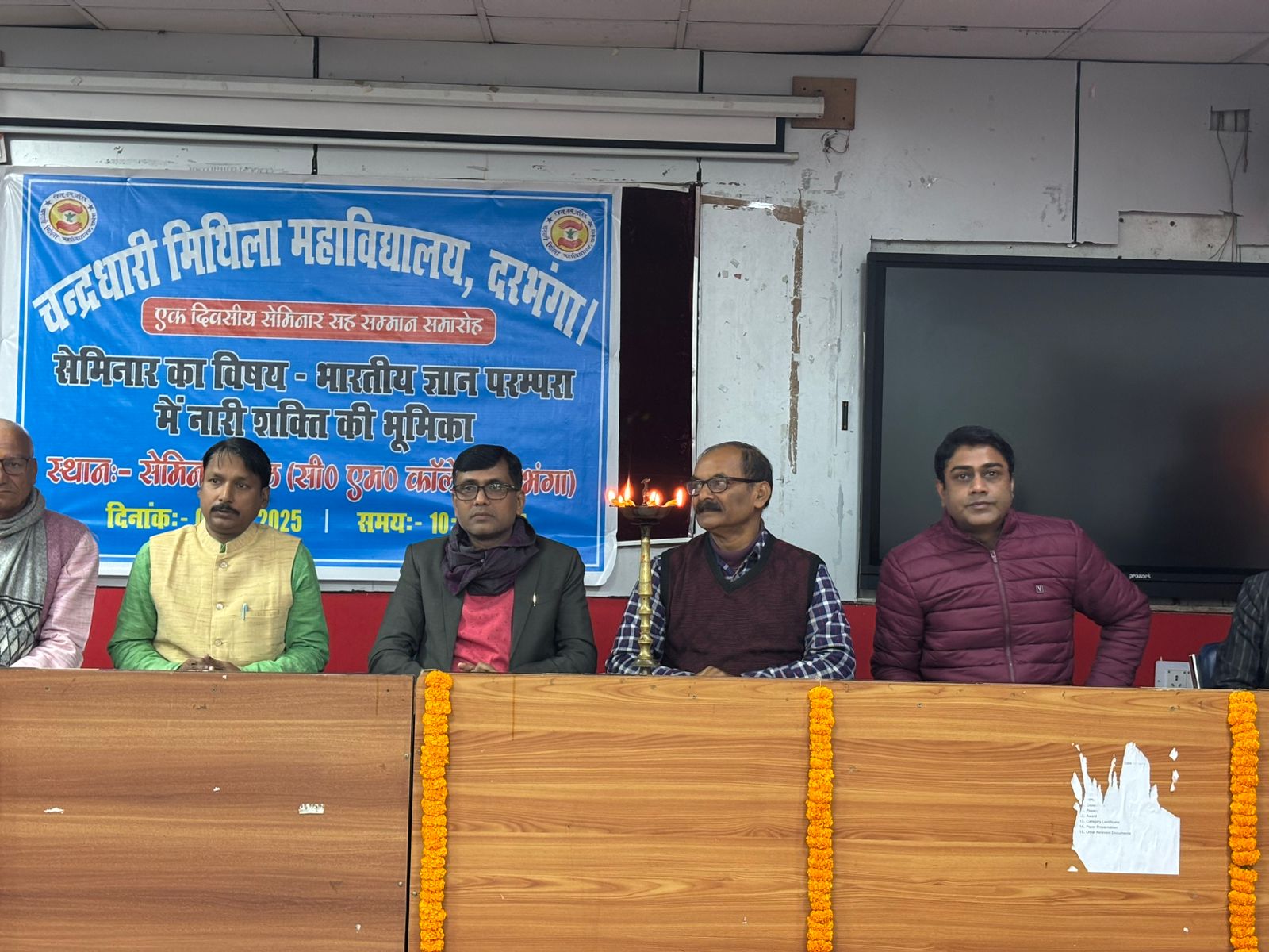 दरभंगा : कॉलेज, दरभंगा के स्नातकोत्तर इतिहास विभाग के द्वारा विभागाध्यक्ष डॉ अखिलेश कुमार ‘विभु’ की अध्यक्षता में एक प्रेरक संगोष्ठी का आयोजन सेमिनार हॉल में किया गया, जिसमें मुख्य रूप से स्नातकोत्तर तृतीय सेमेस्टर 2024-26 के 150 से अधिक छात्र-छात्राओं ने भाग लिया। संगोष्ठी का शुभारंभ दीप प्रज्वलन से हुआ, जबकि अतिथियों का स्वागत पाग एवं चादर से किया गया। वहीं विश्वविद्यालय टॉपर तुलसी कुमारी का इतिहास विभाग द्वारा मोमेंटो, पाग एवं चादर से सम्मानित किया गया। “भारतीय ज्ञान परंपरा में नारी शक्ति की भूमिका” विषय पर आयोजित संगोष्ठी में मुख्य अतिथि के रूप में ललित नारायण मिथिला विश्वविद्यालय के संस्कृत- प्राध्यापक एवं एनएसएस कोऑर्डिनेटर डॉ आर एन चौरसिया, विभाग के प्राध्यापक डॉ मुकेश कुमार रजत- स्वागत कर्ता एवं डॉ अतुल कुमार जायसवाल-धन्यवाद कर्ता, टॉपर छात्रा तुलसी कुमारी के पिता धनंजय चौधरी तथा माता मीरा देवी सहित कई गणमान्य व्यक्तियों ने विचार व्यक्त किया। संचालन आर्यन कुमार ने किया, जबकि स्वागत गीत- ‘मंगलमय दिन आजू हे…’ जयप्रकाश ने प्रस्तुत किया। विचार रखने वाले छात्रों में शारिक नेयाज, वर्षा रानी, प्रतीक कुमार, सौम्या गुप्ता, नरसिंह कुमार साहनी, फिज़ा फ़िरोज़, बबलेश कुमार, हसफ़ा खातून, अंकित कुमार, रौनक आरा और अंजलि कुमारी आदि शामिल थे।