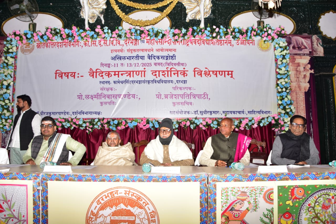 दरभंगा। कामेश्वर सिंह दरभंगा संस्कृत विश्वविद्यालय के स्नातकोत्तर दर्शन विभाग तथा महर्षि सांदीपनि वेद विद्यापीठ के संयुक्त तत्त्वावधान में वैदिक मंत्रों के दार्शनिक विश्लेषण विषय पर आयोजित त्रिदिवसीय अखिल भारतीय वैदिक संगोष्ठी का आज समापन हो गया। देश भर से जुटे विद्वानों ने तीन दिनों के अलग अलग सात सत्रों में खूब मंथन किया और वैदिक मंत्रों के व्यवहारिक पक्षों को उजागर करते हुए उसकी प्रमाणिकताओं को भी सिद्ध किया। समापन सत्र की अध्यक्षता करते हुए कुलपति प्रो0 लक्ष्मी निवास पांडेय ने आनो भद्रा: मन्त्र की व्याख्या करते हुए सभी प्राणियों के लिए सम्भाव रखने की बातें कही। साथ ही उन्होंने संगोष्ठी में विभिन्न राज्यों से आये विशिष्ट विद्वानों के प्रति साधुवाद भी प्रकट किया। वहीं, मुख्यातिथि पद्मश्री पुरस्कार से विभूषित पूर्व कुलपति प्रो.अभिराज राजेन्द्र मिश्र अपने प्रेरक उद्बोधन में उन्होंने वैदिक ज्ञान-परम्परा की वैज्ञानिकता, प्रामाणिकता एवं वैश्विक प्रभाव पर विस्तार से प्रकाश डाला।