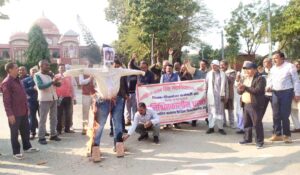दरभंगा। शिक्षक एवं शिक्षकेत्तर कर्मचारी सघ, लोहिया चरण सिंह महाविद्यालय,दरभंगा के बैनर तले सोमवार को पूर्व निर्धारित कार्यक्रम के तहत लनामिविवि के कुलपति, प्रो. संजय कुमार चौधरी का पुतला दहन किया गया। संघ के अध्यक्ष,प्रो राकेश रौशन की अध्यक्षता में पुतला दहन किया गया एवं विवि धरनास्थल पर 86 वे दिन अपनी मांगो को लेकर लोहिया चरण सिंह महाविद्यालय, दरभंगा के शिक्षक एवं शिक्षकेतर कर्मी अनिश्चितकालीन धरना पर बैठे रहे। वही पुतला दहन के पूर्व विवि परिसर में बैनर के साथ पूरे विश्वविद्यालय परिसर में प्रदर्शन करते हुए चक्कर लगाया गया। इसके बाद विवि और बाबा साहेब डॉ भीमराव अम्बेडकर की प्रतिमा के सामने पुतला दहन किया गया इसके बाद संघ के अध्यक्ष ने प्रो. राकेश रौशन ने कहा यहां इस विश्वविद्यालय में शासन और रूल रेगुलेशन नाम की कोई चीज नहीं रह गई है। उन्होंने कहा वर्तमान कुलपति अपनी मनमानी करते हैं यहां ना विश्वविद्यालय कानून चलता है और ना ही संवैधानिक नियम कानून चलते हैं। यहा जिसके मन में जो आ रहा है वह वही कर रहा है। कुलपति एक बार हम लोगों से मिले तो उन्होंने कहा था इलेक्शन के बाद हम आप लोगों की मांगों को पूरा करेंगे। लेकिन आज तक यहां से कुछ भी नहीं किया गया इसके बाद आज मजबूर होकर कुलपति का पुतला दहन किया गया। उनका पुतला दहन उनके कानों तक अपनी आवाज पहुंचने के लिए किया। इसके बावजूद हम लोगों की मांगों को पूरा नहीं किया गया तो उग्र रूप से हम लोग कार्य करेंगे और मांगों को रखेंगे। वहीं उन्होंने कहा आज विश्वविद्यालय में छात्रों का भी प्रदर्शन मांगों को लेकर देखा गया। छात्रों का यही मामला है जैसे हम लोगों का मामला है इसको कैंसिल करो उसको रखो। यही विश्वविद्यालय प्रशासन और कुलपति के द्वारा किया जा रहा है। पूरी तरह से विश्वविद्यालय प्रशासन और कुलपति के द्वारा मनमाना किया जा रहा है। प्रो. जीवत राम यादव ने कहा अगर कुलपति के पुतला दहन के बाद भी इससे भी सुनवाई नहीं हुई तो हम लोग अर्धनग्न प्रदर्शन करते हुए विश्वविद्यालय में तालाबंदी एवं कुलपति की शव यात्रा निकाली जाएगी। इस संबंध में कुलसचिव को पत्र के माध्यम से अवगत कराया गया। चरण सिंह महाविद्यालय के शिक्षक एवं शिक्षकेत्तर कर्मचारी संघ का 86 वे दिन भी धरना जारी है।