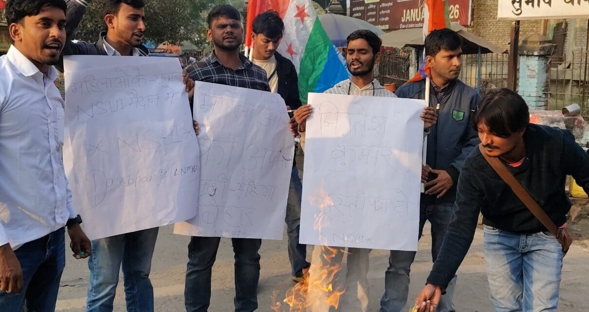 दरभंगा (बिनोद कुमार) : ललित नारायण मिथिला विश्वविद्यालय की NSUI इकाई ने नियुक्ति-पत्र वितरण के दौरान मुख्यमंत्री नीतीश कुमार द्वारा महिला डॉक्टर का हिजाब खींचने के विरोध में आज विवि परिसर में प्रदर्शन किया और सीएम का पुतला दहन किया.