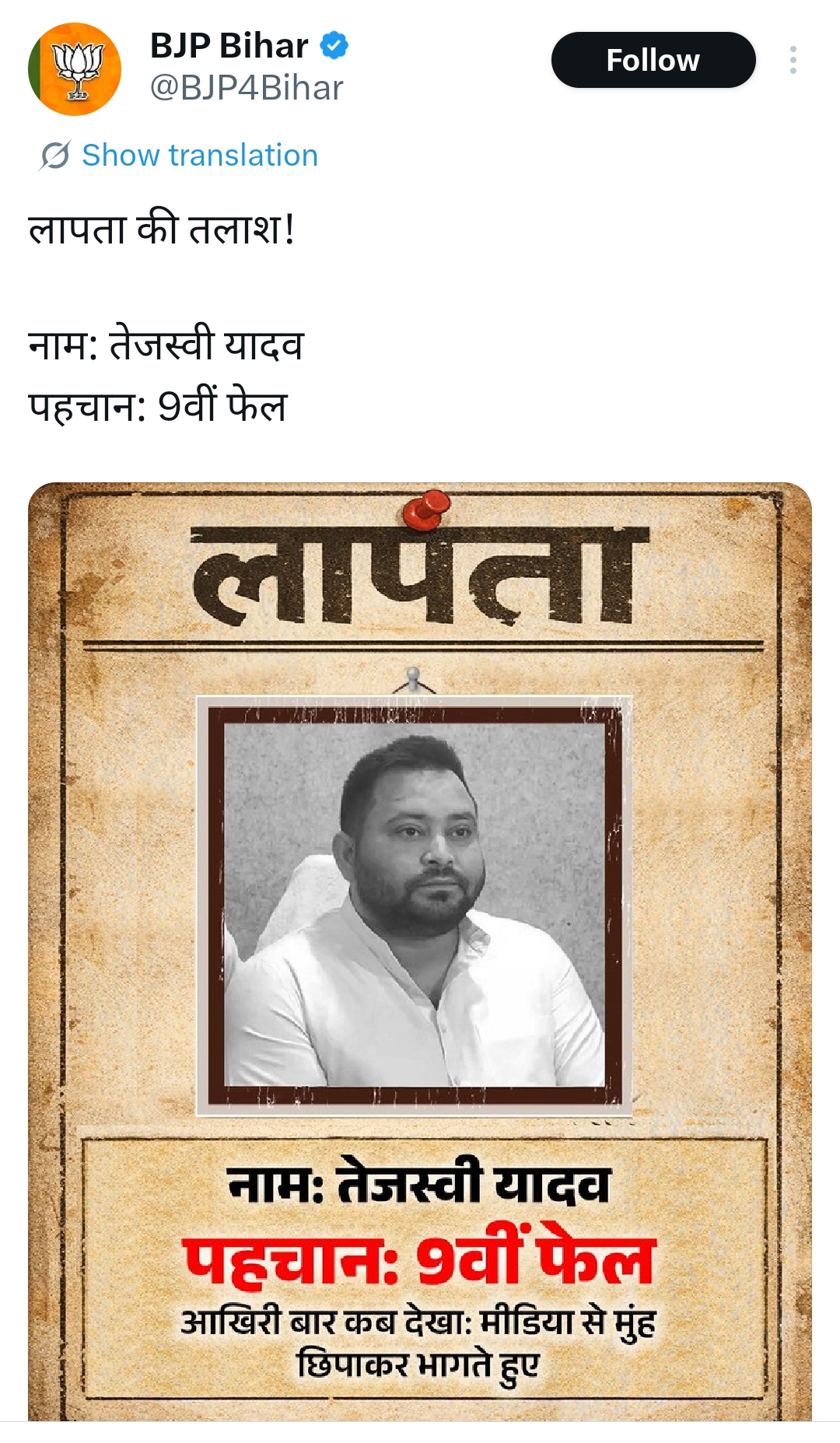 प्रादेशिक बिहार बिहार : BJP ने जारी किया पोस्टर, लिखा- ‘लापता की तलाश ! नाम : तेजस्वी यादव, पहचान : 9वीं फेल’ Posted on December 17, 2025December 17, 2025 Author admin Comment(0)