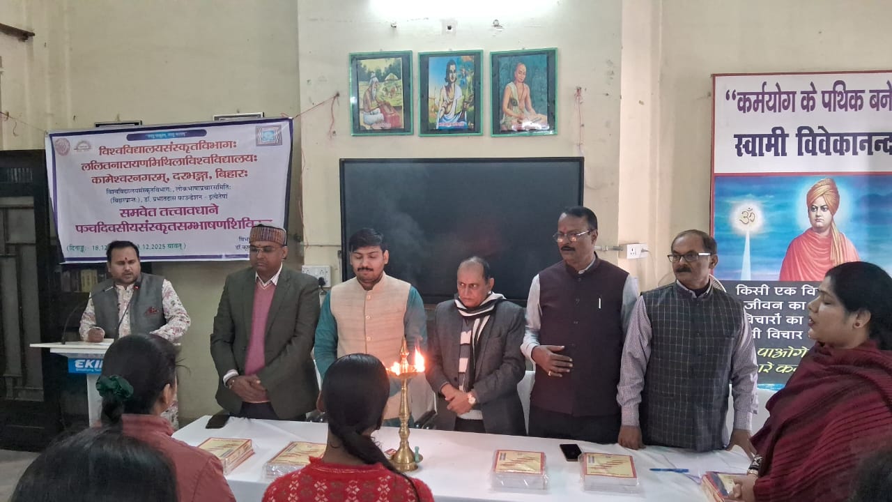 दरभंगा : ललित नारायण मिथिला विश्वविद्यालय, दरभंगा के स्नातकोत्तर संस्कृत विभाग, लोकभाषा प्रचार समिति, बिहार प्रान्त एवं डॉ प्रभात दास फाउंडेशन, दरभंगा के संयुक्त तत्त्वावधान में पांच दिवसीय संस्कृत संभाषण शिविर का उद्घाटन सत्र पीजी संस्कृत विभाग में अध्यक्ष डॉ कृष्णकान्त झा की अध्यक्षता में आयोजित की गई, जिसमें सीएमबी कॉलेज, घोघरडीया के प्रधानाचार्य प्रो जीवानन्द झा- उद्धाटक, संस्कृत विश्वविद्यालय के दर्शन-विभागाध्यक्ष डॉ धीरज कुमार पांडेय- मुख्य अतिथि, सीएम कॉलेज, दरभंगा के संस्कृत विभागाध्यक्ष डॉ संजीत कुमार झा- मुख्य वक्ता, विभागीय प्राध्यापिका डॉ ममता स्नेही- स्वागत कर्ता, संस्कृत अध्ययन केन्द्र के अधिकारी डॉ आर एन चौरसिया- धन्यवाद कर्ता एवं शिविर प्रशिक्षक अमित कुमार झा- संचालन कर्ता के साथ ही संस्कृत-प्राध्यापिका डॉ मोना शर्मा एवं शिवम कुमार आदि ने विचार रखें। शिविर में कुमकुम कुमारी ने संस्कृत में स्वागत गीत गाया, जबकि वैदिक मंगलाचरण- डॉ सोमेश्वर नाथ दधीचि तथा पौराणिक मंगलाचरण- शोधार्थी सुधांशु कुमार ने प्रस्तुत किया। इस अवसर पर शोधार्थी- अनिमेष मंडल एवं सोनाली मंडल, छात्र- ईशान, दीपेश कुमार, रीमा कुमारी, जूही कुमारी, रंजना कुमारी, रागनी कुमारी, विमलेश कुमार झा, कृष्णा पासवान, रोशन कुमार तथा दयानंद कुमार आदि ने सक्रिय योगदान किया। कार्यक्रम का उद्घाटन अतिथियों द्वारा दीप प्रज्वलन से हुआ, जबकि अतिथियों का स्वागत पाग एवं चादर से किया गया। इस अवसर पर शिविर प्रशिक्षक अमित कुमार झा ने सहभागियों का प्रारंभिक वर्ग लिया।
