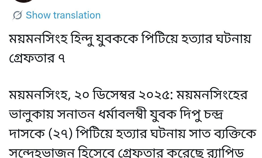अंतरराष्ट्रीय बांग्लादेश : हिंदू युवक की मॉब लिंचिंग मामले में 7 कट्टरपंथी उन्मादी गिरफ्तार, मोहम्मद यूनुस ने खुद दी जानकारी Posted on December 20, 2025December 20, 2025 Author admin Comment(0)