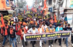 दरभंगा। आक्रोश यात्रा मंच, जिला दरभंगा के तत्वावधान में आज बांग्लादेश में हिंदू समाज पर हो रहे अत्याचारों के विरोध में राजीव प्रकाश मधुकर एवं सुरेंद्र सहनी की अध्यक्षता में विशाल आक्रोश मार्च निकाला गया। वही राहुल कुमार सहनी, रवि कुमार के संयुक्त नेतृत्व में आयोजित आक्रोश मार्च निकाली गई। इसके संरक्षक मंडल विश्व हिंदू परिषद के मंत्री रिंकू झा, जिला सुरक्षा प्रमुख पंकज बारी, विजय शाह, अखिलेश भट्ट, अंतर्राष्ट्रीय हिंदू परिषद जिलाध्यक्ष राघव झा, मनोज सहनी, सुमित कुमार राय, गौ रक्षा प्रमुख विजय देव, मुन्ना ठाकुर, विकास साहनी,महेंद्र सहनी,दीपक कुमार,राजीव कुमार झा,भगवान लाल ठाकुर,तिरुपति ठाकुर,रंजीत कुमार, अमित कुमार,मिथिलेश सहनी सहित अन्य शामिल हुए आक्रोश मार्च बाजार समिति चौक से प्रारंभ होकर गेहूं मंडी चौक, आजमनगर, केदराबाद नाका, दो गांधी चौक, कटकी बाजार, दरभंगा टावर, भगत सिंह चौक, मिर्जापुर चौक होते हुए मनोकामना मंदिर तक पहुँचा। इस आक्रोश मार्च में हजारों की संख्या में कारकोली भालनी गेहूमी,रत्नोपट्टी लहेरियासराय,बालू घाट,अलीनगर से बड़ी संख्या में सनातन धर्मावलंबियों ने भाग लिया। प्रतिभागियों ने हाथों में तख्तियाँ एवं बैनर लेकर बांग्लादेश में हिंदुओं पर हो रहे नरसंहार, अत्याचार एवं महिलाओं के साथ अमानवीय कृत्यों के विरोध में अपना आक्रोश शांतिपूर्ण ढंग से प्रकट किया। बांग्लादेश सरकार से दोषियों पर कठोर कार्रवाई की मांग की।