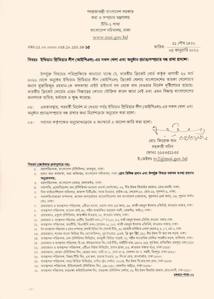 अंतरराष्ट्रीय बांग्लादेश : यूनुस सरकार ने IPL के प्रसारण पर लगाई रोक ! Posted on January 5, 2026 Author admin Comment(0)