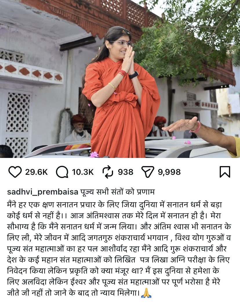 राष्ट्रीय राजस्थान : मशहूर कथावाचिका साध्वी प्रेम बाईसा की रहस्यमय ढंग से मौत ! 4 घंटे बाद इंस्टाग्राम अकाउंट से पोस्ट हुआ सुसाइड नोट ! Posted on January 29, 2026January 29, 2026 Author admin Comment(0) साध्वी को बुखार था. आश्रम के ही किसी कंपाउंडर ने इंजेक्शन लगवाया था. इसके बाद उनकी मौत हो गई .फिलहाल पुलिस मामले की जांच में जुटी है.