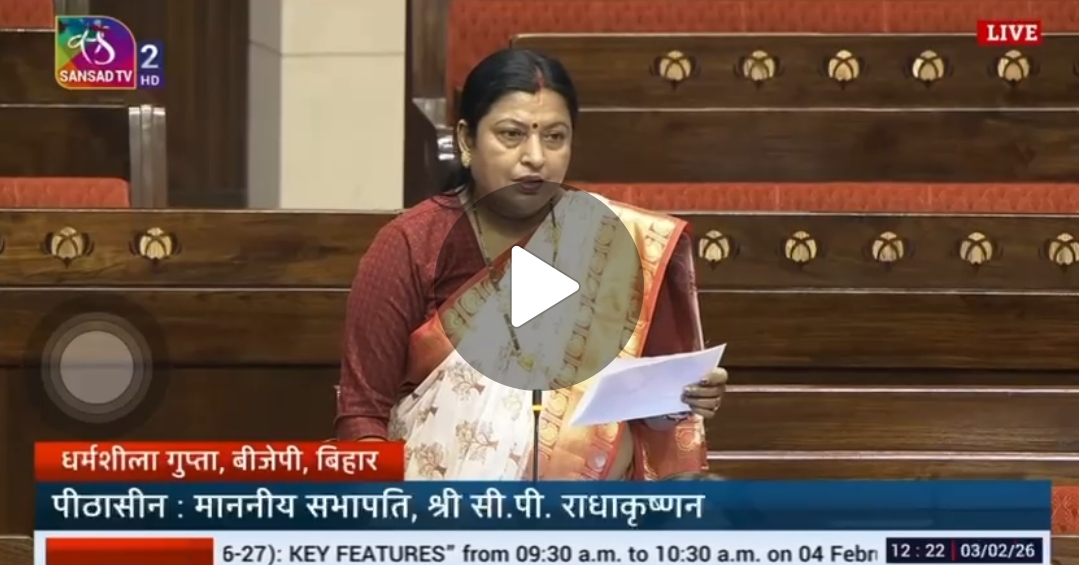 नई दिल्ली (निशांत झा) : भाजपा की राज्यसभा सांसद डॉ. धर्मशीला गुप्ता ने संसद में बिहार में आयुर्वेदिक सेवाओं और अनुसंधान से जुड़े मुद्दे को प्रमुखता से उठाया। प्रश्नकाल के दौरान उन्होंने आयुष मंत्री (स्वतंत्र प्रभार) प्रतापराव गणपतराव जाधव से सीधे सवाल करते हुए पूछा कि बिहार की आबादी और वहां आयुर्वेद की लोकप्रियता को देखते हुए क्या राज्य की मौजूदा व्यवस्था पर्याप्त है।