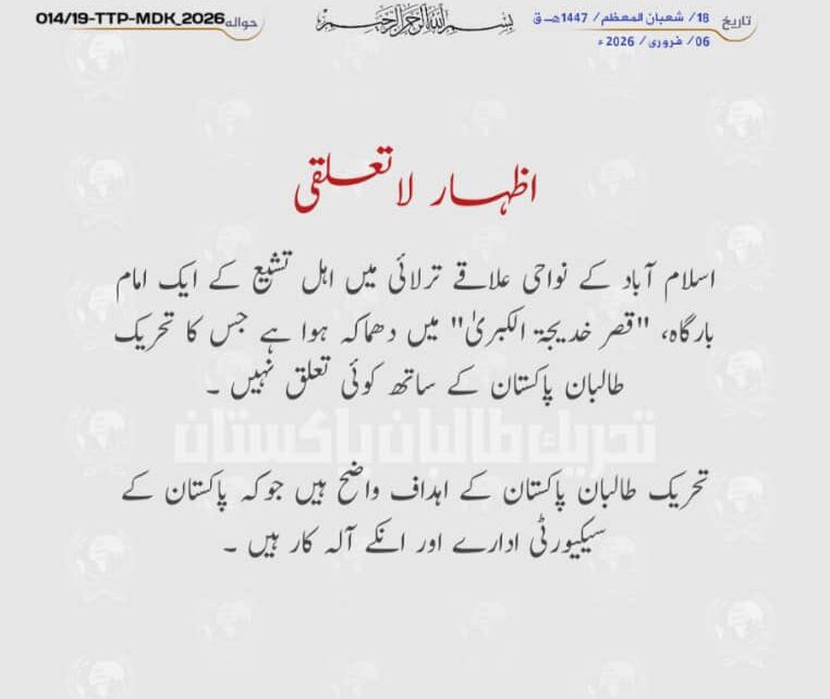 अंतरराष्ट्रीय तहरीक-ए-तालिबान पाकिस्तान ने की इस्लामाबाद में हुए आत्मघाती बम हमले की निंदा ! कहा- यह इस्लामी सिद्धांतों के खिलाफ है Posted on February 6, 2026 Author admin Comment(0)