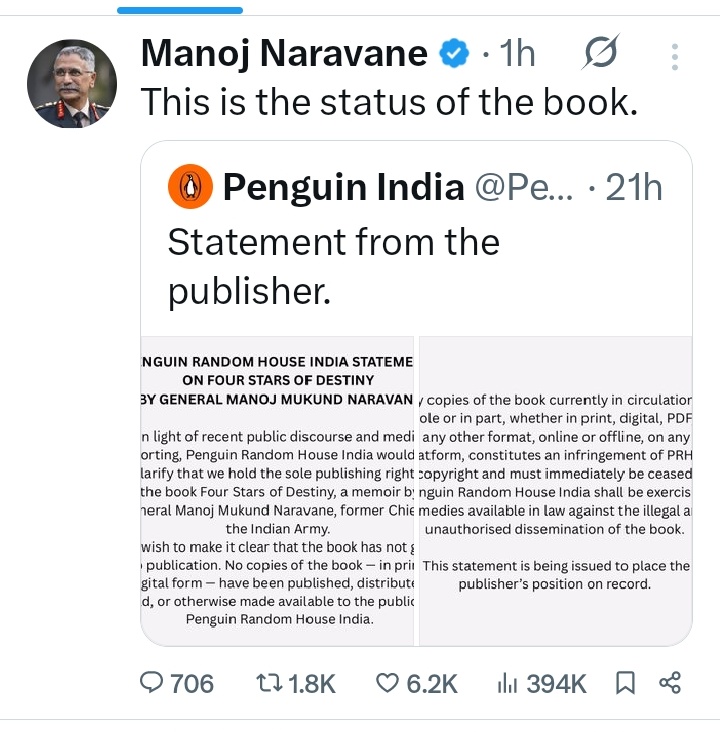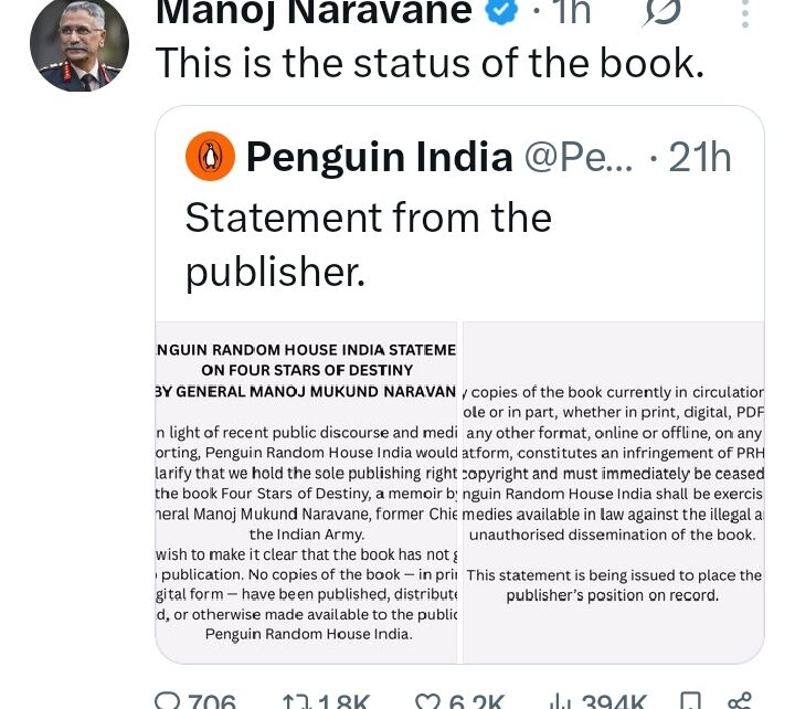 अन्य पूर्व आर्मी चीफ ने किताब विवाद पर तोड़ी चुप्पी ! पब्लिशर पेंगुइन इंडिया के स्पष्टीकरण पर लगाई मुहर ! Posted on February 10, 2026 Author admin Comment(0)