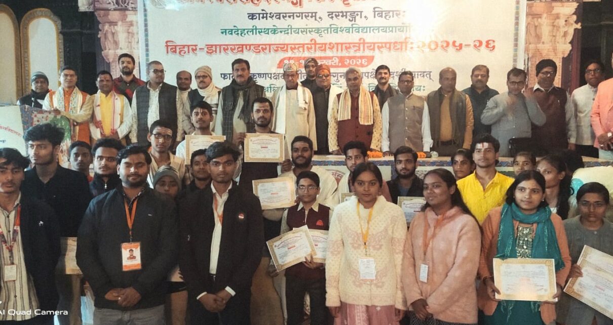 दरभंगा। कामेश्वर सिंह दरभंगा विश्वविद्यालय, दरभंगा एवं नई दिल्ली स्थित केंद्रीय संस्कृत विश्वविद्यालय के संयुक्त तत्वावधान में बिहार -झारखंड राज्य स्तरीय दो दिवसीय शास्त्र स्पर्धा का सफल आयोजन किया गया। संस्कृत विश्वविद्यालय के सीनेट हॉल में आयोजित इस शास्त्रीय प्रतियोगिता में विभिन्न शास्त्रों के प्रतिभाशाली विद्यार्थियों की सहभागिता रही। कुलपति प्रो. लक्ष्मीनिवास पांडेय की अध्यक्षता में आयोजित उद्घाटन सत्र में वक्ताओं ने सभी प्रतिभागियों का उत्साहवर्धन किया मुख्यातिथि प्रो. सुरेश्वर झा ने शास्त्रीय अध्ययन की महत्ता पर प्रकाश डाला।सारस्वत अतिथि डीन प्रो. पुरेन्द्र वारिक ने भी शास्त्रीय स्पर्धा की विशेषता व प्रासंगिकता पर विस्तार से बताया। कार्यक्रम का संयोजन एवं संचालन व्याकरण विभाग के सहायक प्राध्यापक डॉ. यदुवीरस्वरूप शास्त्री द्वारा किया गया। उक्त जानकारी देते हुए पीआरओ निशिकांत ने बताया कि शास्त्र स्पर्धाओं के अंतर्गत ज्योतिष शलाका, भगवद्गीता कण्ठपाठ, काव्य शलाका, सुभाषित कण्ठपाठ, काव्य कण्ठपाठ, व्याकरण शलाका, अष्टाध्यायी कण्ठपाठ, धातुरूप कण्ठपाठ, अमरकोष कण्ठपाठ समेत कई शास्त्रीय प्रतियोगिताएँ आयोजित की गईं। इसके अलावा व्याकरण भाषण ,साहित्य भाषण ,वेद भाष्य भाषण भारतीय विज्ञान भाषण,आयुर्वेद भाषण ,धर्मशास्त्र भाषण , ज्योतिष भाषण ,सांख्य–योग भाषण,न्याय भाषण ,मीमांसा भाषण ,वेदान्त भाषण जैसी प्रतियोगिता आयोजित की गई। कुलपति प्रो. लक्ष्मीनिवास पाण्डेय की अध्यक्षता में आयोजित समापन समारोह में मुख्यातिथि प्रो. रामचन्द्र झा, पूर्व कुलपति, का.सिं.द.सं.वि., दरभंगा रहे। विशिष्ट अतिथि कुलसचिव प्रो. ब्रजेशपति त्रिपाठी ने भी बच्चों का हौसला बढ़ाया और ऐसी स्पर्धा में गम्भीरता से भाग लेने को कहा। सारस्वत अतिथि डीन प्रो. पुरेन्द्र वारिक ने भी विद्यार्थियों का उत्साहवर्धन किया। समापन कार्यक्रम का सह–संयोजन एवं संचालन डॉ. अवधेश कुमार श्रोत्रिय, ज्योतिष विभाग, का.सिं.द.सं.वि., दरभंगा द्वारा किया गया। अतिथियों ने इस आयोजन को शास्त्रीय प्रतिभा के विकास की दिशा में अत्यंत उपयोगी बताते हुए आयोजकों एवं प्रतिभागियों की सराहना की।अंत मे सफल बच्चों को उत्साहित करने के लिए नकद राशि भी प्रदान की गई।