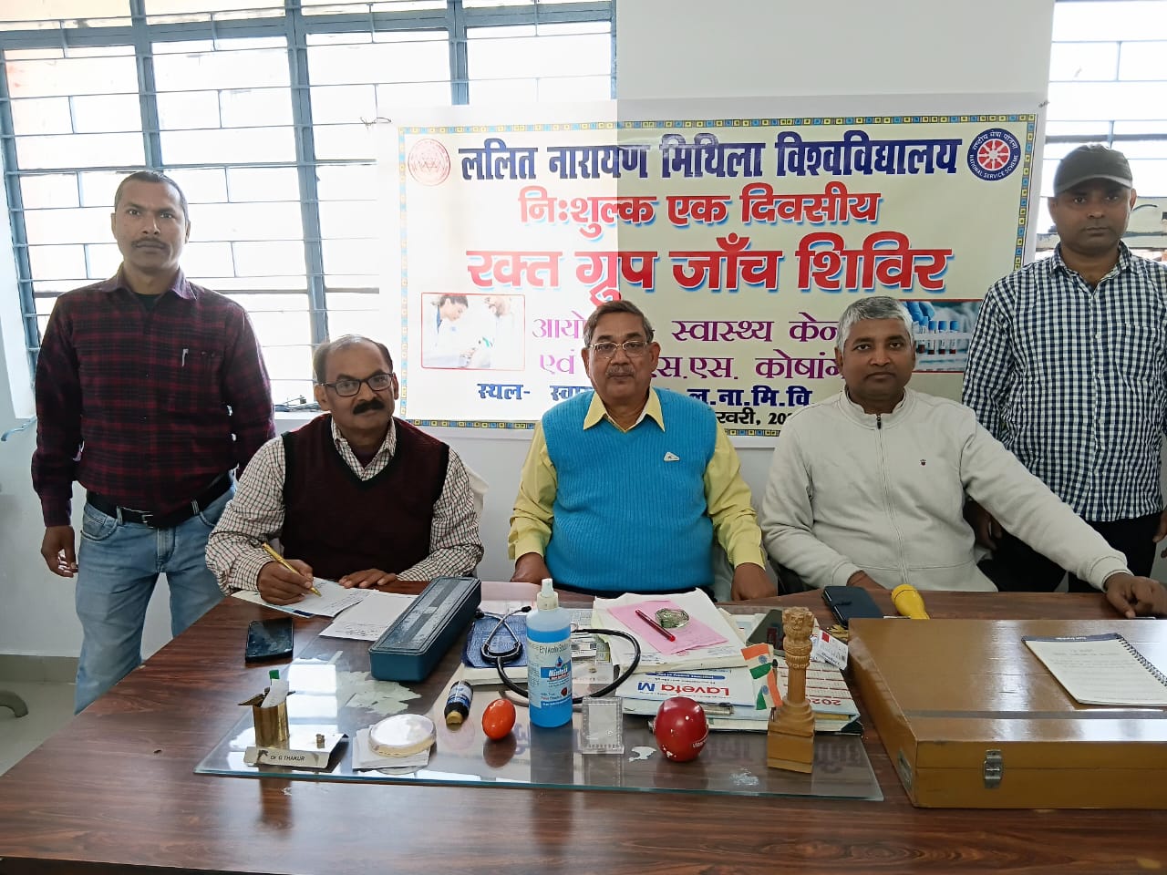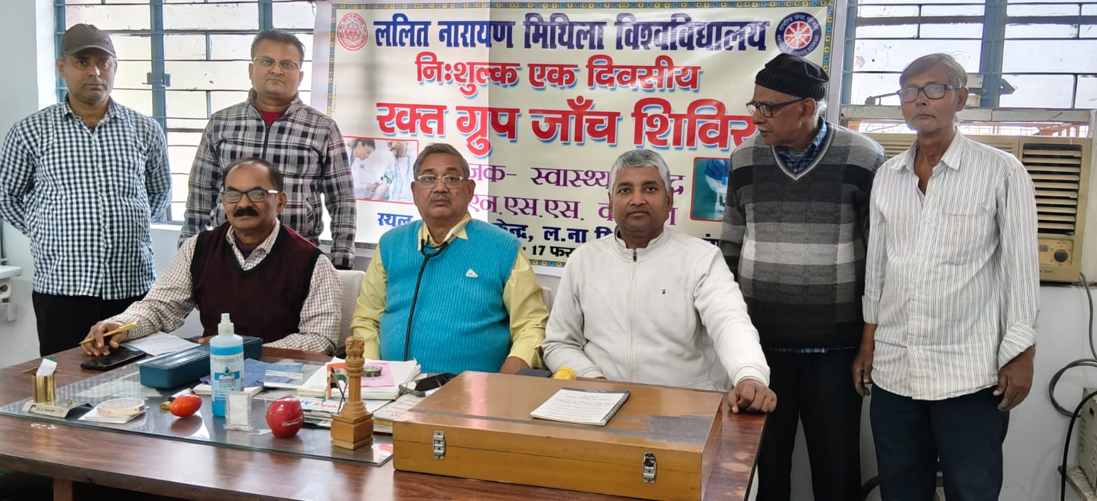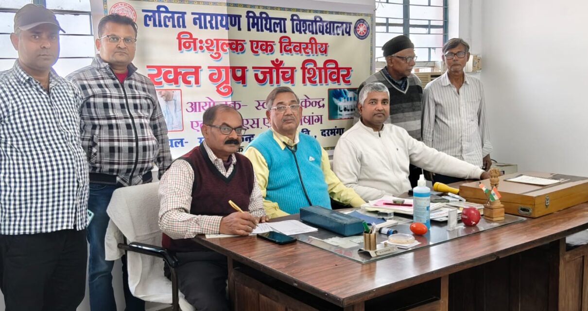 दरभंगा : ललित नारायण मिथिला विश्वविद्यालय, दरभंगा के कुलपति प्रोफेसर संजय कुमार चौधरी के आदेश से विश्वविद्यालय स्वास्थ्य केन्द्र तथा एनएसएस कोषांग के संयुक्त तत्त्वावधान में दिनांक 18 फरवरी, 2026 को स्वास्थ्य केन्द्र में निःशुल्क रक्त ग्रुप जांच शिविर का आयोजन किया जा रहा है, जिसमें मुख्य रूप से स्नातकोत्तर एनएसएस इकाई एवं दूरस्थ शिक्षा निदेशालय द्वारा संचालित बीएड (नियमित) के एनएसएस स्वयंसेवकों के साथ ही अन्य छात्र-छात्राएं भी भाग लेंगे।कार्यक्रम की रूपरेखा तैयार करने के उद्देश्य से केन्द्र के चिकित्सा पदाधिकारी डॉ गीतेन्द्र ठाकुर की अध्यक्षता में बैठक हुई, जिसमें एनएसएस समन्वयक डॉ आर एन चौरसिया, पीजी एनएसएस के कार्यक्रम पदाधिकारी डॉ सोनू राम शंकर, अनुपम कुमार, राजेश रोशन, अशोक झा, अजमत इमाम तथा शिवनाथ आदि उपस्थित थे।