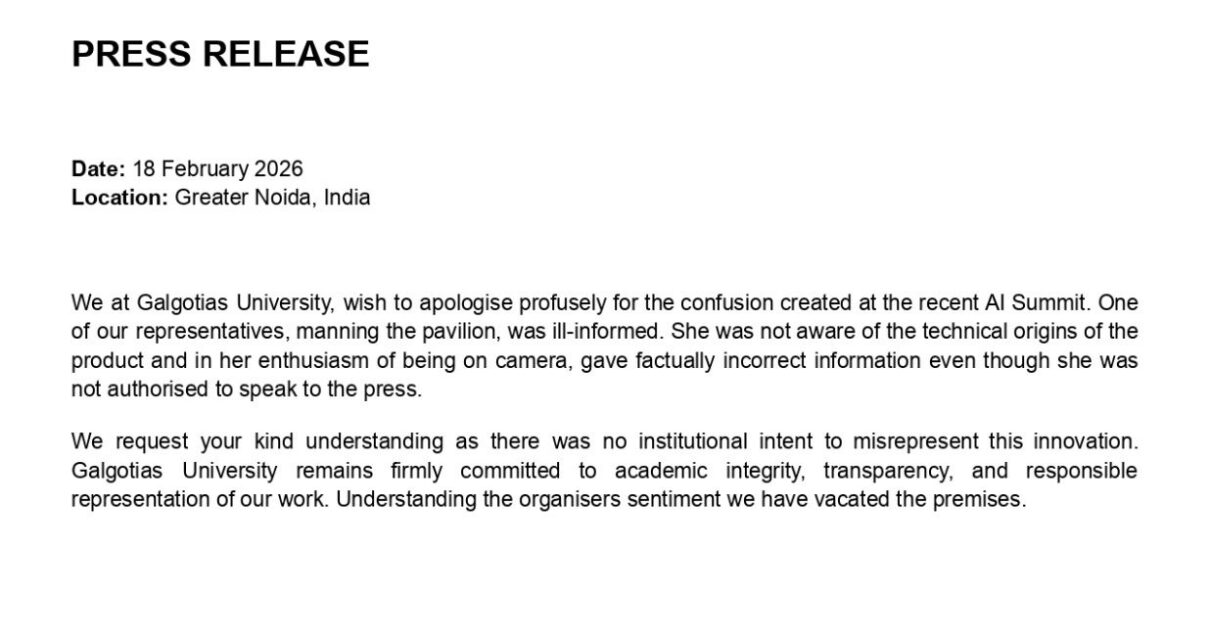 ‘हम AI समिट में हुई गड़बड़ी के लिए तहेदिल से माफी मांगते हैं. पवेलियन में मौजूद हमारी एक प्रतिनिधि को तकनीकी जानकारी नहीं थी. कैमरे के सामने होने के उत्साह में उन्होंने गलत जानकारी दे दी, जबकि उन्हें प्रेस से बात करने का अधिकार नहीं था. आयोजकों की भावनाओं को समझते हुए हमने परिसर खाली कर दिया है.’