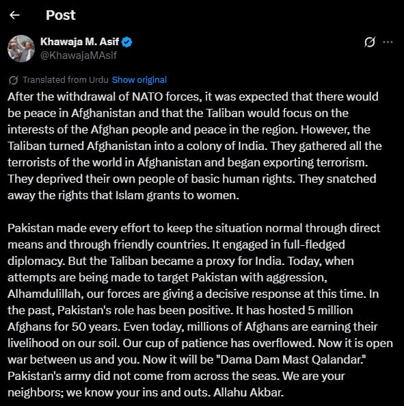 अंतरराष्ट्रीय तालिबान ने अफगानिस्तान को ‘भारत की कॉलोनी’ बना दिया : पाकिस्तान के रक्षा मंत्री ख्वाजा आसिफ Posted on February 27, 2026February 27, 2026 Author admin Comment(0)
