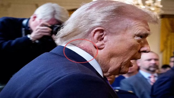 डेस्क: अमेरिकी राष्ट्रपति डोनाल्ड ट्रंप (US President Donald Trump) की गर्दन (Neck) पर दिखाई दिए लाल निशान (red mark) ने इस हफ्ते मीडिया और फोटोग्राफरों का ध्यान खींचा और सोशल मीडिया पर भी तरह-तरह की चर्चाओं को जन्म दिया। सोमवार को व्हाइट हाउस में आयोजित मेडल ऑफ ऑनर समारोह (Medal of Honor ceremony) के दौरान ली गई तस्वीरों में ट्रंप की गर्दन के दाईं ओर कॉलर के ऊपर लाल पैच साफ नजर आया। 79 वर्षीय राष्ट्रपति की सेहत को लेकर तुरंत सवाल उठने लगे।