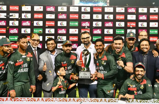 डेस्क : Bangladesh national cricket team ने शानदार प्रदर्शन करते हुए Pakistan national cricket team को तीसरे वनडे में 11 रन से हराकर सीरीज 2–1 से अपने नाम कर ली। मीरपुर में खेले गए इस निर्णायक मुकाबले में बांग्लादेश की जीत के हीरो रहे तंज़ीद हसन का शानदार शतक और तस्किन अहमद की घातक गेंदबाजी। इस जीत के साथ बांग्लादेश ने 11 साल बाद पाकिस्तान के खिलाफ द्विपक्षीय वनडे सीरीज जीतकर बड़ा रिकॉर्ड भी बना लिया।