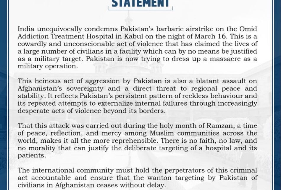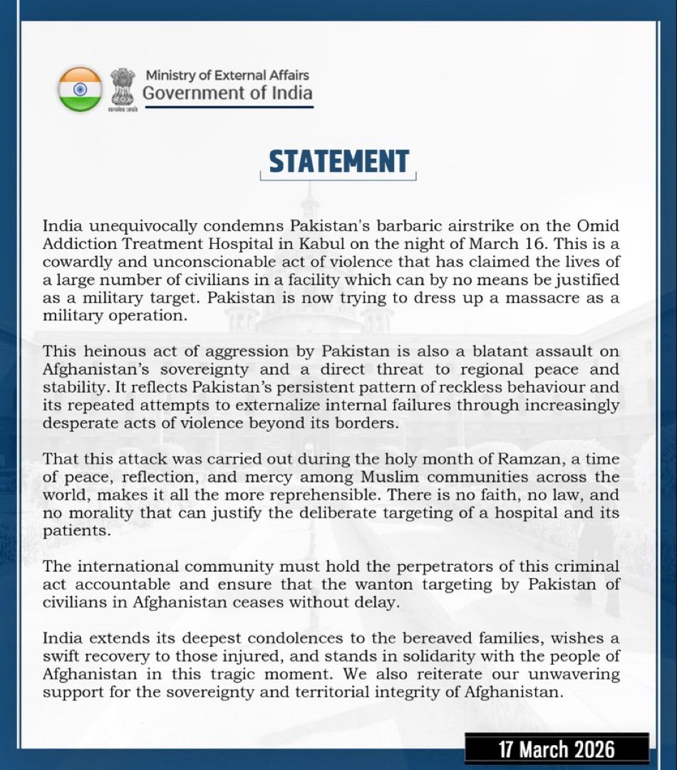 अंतरराष्ट्रीय काबुल पर पाकिस्तानी एयर स्ट्राइक की भारत ने की निंदा Posted on March 17, 2026 Author admin Comment(0)