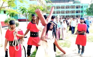 होली रोसरी चर्च के पल्ली पुरोहित श्रद्देय फादर बेन्नी पॉल सी० एस० टी० ने प्रभु येसु के दुःखभोग का स्मरण और शब्द समारोह (प्रार्थना सभा) को संबोधित करते हुए प्रभु यीशु मसीह की कुर्बानी के बारे में विस्तार से बताया। उन्होंने बताया प्रभु ईसा मसीह प्रेम और शांति के मसीहा थे। उन्होंने कहा ऐसी मान्यता है की इस दिन ईसा मसीह ने मानवता के पापों के लिए अपने प्राण त्याग दिए थे। इसलिए इसे त्याग, प्रेम और क्षमा का प्रतीक माना जाता है। हालाँकि यह एक दुखद घटना थी, फिर भी इसे “गुड” (अच्छा) इसलिए कहा जाता है क्योंकि ईसा मसीह के बलिदान को मानवता के लिए उद्धार का मार्ग माना जाता है। उन्होंने अपने संदेश में बताया कि गुड फ्राइडे (पुण्य शुक्रवार) को प्रभु यीशु मसीह के मुख से मृत्यु पूर्व ये मार्मिक शब्द निकले थे, “हे ईश्वर इन्हें क्षमा करें, क्योंकि ये नहीं जानते कि ये क्या कर रहे हैं,”। आज से करीब 2008 वर्ष पहले ईसा मसीह यरूशलम मे रह कर मानवता के कल्याण के लिए भाईचारे, एकता और शांति के उपदेश देते थे। उन्हें प्रेम, सत्य,और विश्वास के मार्ग पर चलने की प्रेरणा का संदेश देते थे। उस समय के धार्मिक कट्टरपंथी यहूदीयों ने रोम के शासक से शिकायत कर उन्हें कलवारी के पहाड़ी पर क्रॉस (सूली) पर लटका दिया था। वह दिन फ्राइडे ( शुक्रवार) था, यही वजह है कि ईसाई धर्म को मानने वाले लोग गुड फ्राइडे के दिन को प्रभु यीशु मसीह के बलिदान दिवस के रूप में याद करते है। यह दिन ईसाई धर्म के अनुयायियों के लिए बेहद खास होता है। पल्ली परोहित, फादर रॉय मैथ्यू. सी.एस.टी ने पुण्य शुक्रवार (गुड फ्राइडे) के महत्व को रेखांकित करते हुए कहा यह ईसाई धर्म का एक अत्यंत पवित्र और गंभीर दिवस है, जिस दिन येसु मसीह के क्रूस पर चढ़ाए जाने और उनके बलिदान को स्मरण किया जाता है। यह दिन मानवता के प्रति उनके असीम प्रेम, त्याग और क्षमा के संदेश को दर्शाता है। येसु मसीह ने अपने जीवन के अंतिम क्षणों में भी लोगों को प्रेम, करुणा और क्षमा का मार्ग दिखाया, यहाँ तक कि जिन्होंने उन्हें कष्ट दिया, उनके लिए भी उन्होंने ईश्वर से क्षमा की प्रार्थना की। येसु मसीह का क्रूस पर बलिदान केवल एक ऐतिहासिक घटना नहीं है, बल्कि यह आज भी मानव जीवन के लिए अत्यंत प्रासंगिक है। फादर मैथ्यू ने कहा कि आज की दुनिया, जहाँ युद्ध, हिंसा, घृणा और स्वार्थ बढ़ते जा रहे हैं, वहाँ प्रभु येसु के द्वारा दिए गए प्रेम, शांति, सहनशीलता और क्षमा के मूल्य हमें सही रास्ता दिखाते हैं। उनका जीवन हमें सिखाता है कि कठिन परिस्थितियों में भी सत्य और धर्म का मार्ग नहीं छोड़ना चाहिए। आज के समय में जब समाज विभाजन और संघर्ष का सामना कर रहा है, येसु मसीह के उपदेश हमें एकता, भाईचारा और मानवता की ओर प्रेरित करता है। उनका बलिदान हम