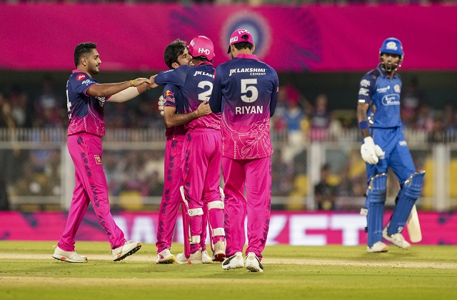 मुंबई की ओर से नमन धीर (25) और शेरफेन रदरफोर्ड (25) ही 20 रन के आंकड़े को पार कर पाए। रॉयल्स की ओर से नांद्रे बर्गर (21 रन पर दो विकेट), रवि बिश्नोई (25 रन पर दो विकेट) और संदीप शर्मा (26 रन पर दो विकेट) ने दो-दो विकेट चटकाए। जायसवाल ने इससे पहले 32 गेंद में चार छक्कों और 10 चौकों से नाबाद 77 रन की पारी खेलने के अलावा वैभव सूर्यवंशी (39 रन, 14 गेंद, पांच छक्के, एक चौके) के साथ पांच ओवर में 80 रन जोड़े जिससे रॉयल्स ने तीन विकेट पर 150 रन बनाए। मुंबई की ओर से स्पिनर अल्लाह गजनफर सबसे सफल गेंदबाज रहे जिन्होंने 21 रन देकर दो विकेट चटकाए। शारदुल ठाकुर ने भी 36 रन देकर एक विकेट हासिल किया।